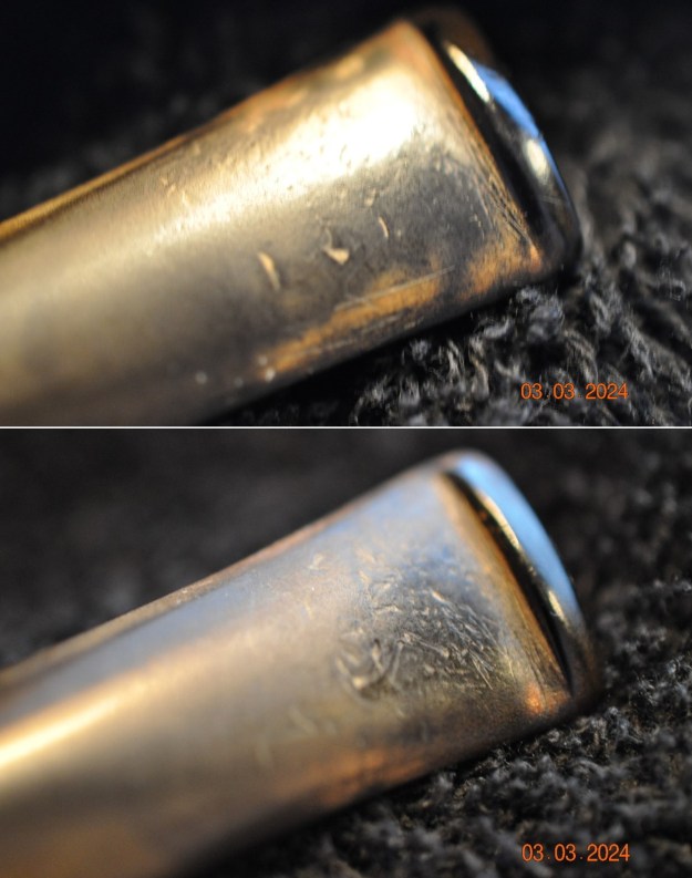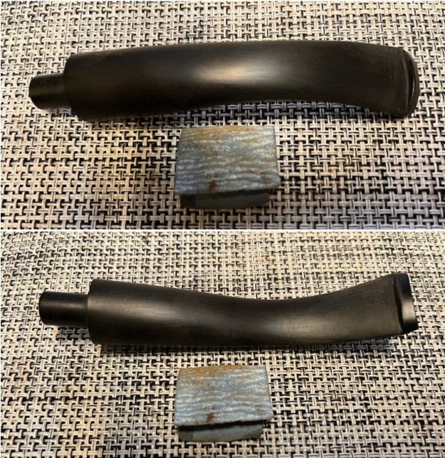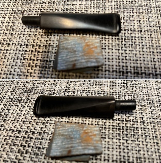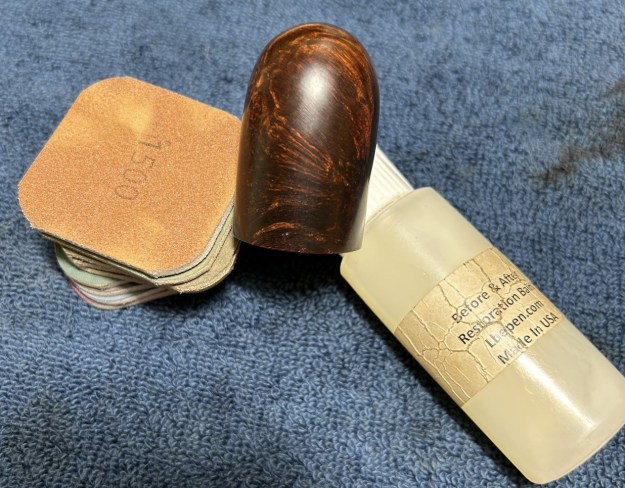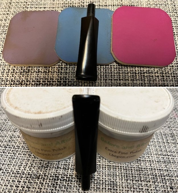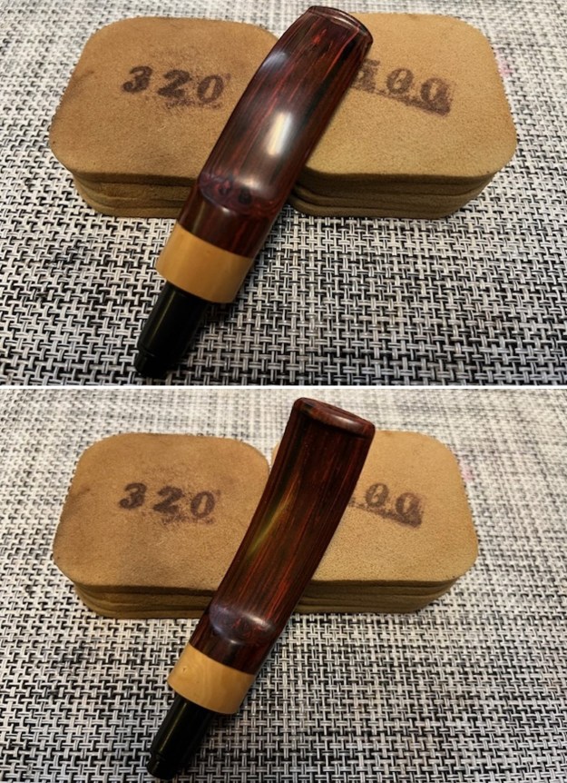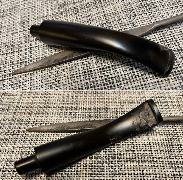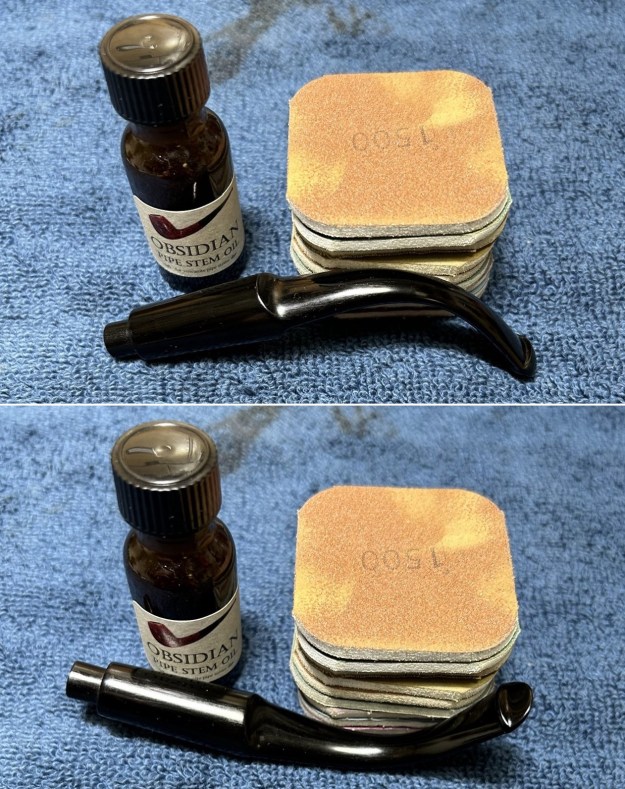 Following the alcohol soak, the stem was screwed back on. I used heat to lift some of the teeth indentions, but a few minor marks remain. I removed the oxidation with 800, 1,500 and 2,000 grade wet paper. The stem was then buffed with White Diamond rouge and Meguiars plastic polish.
