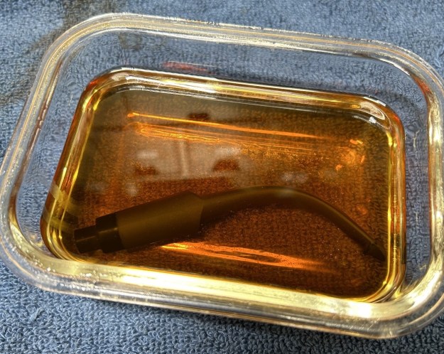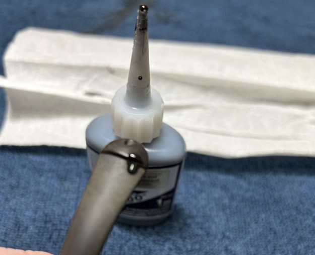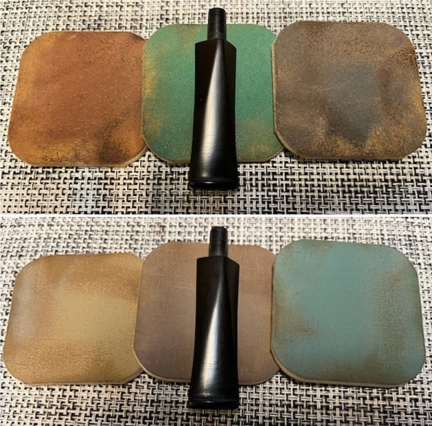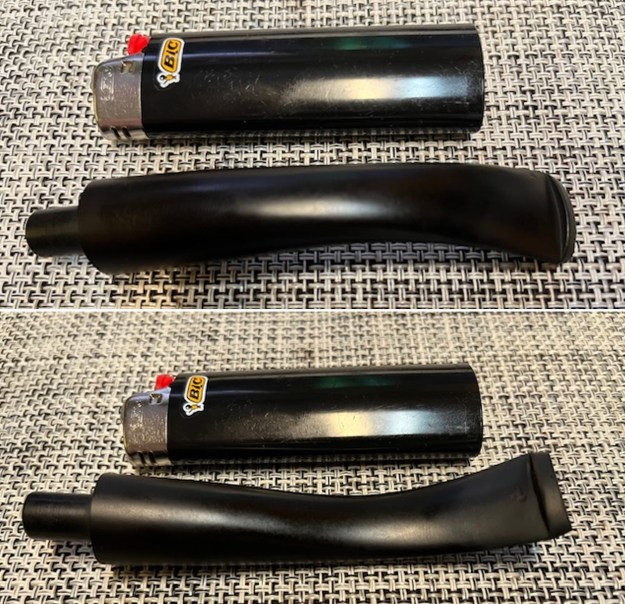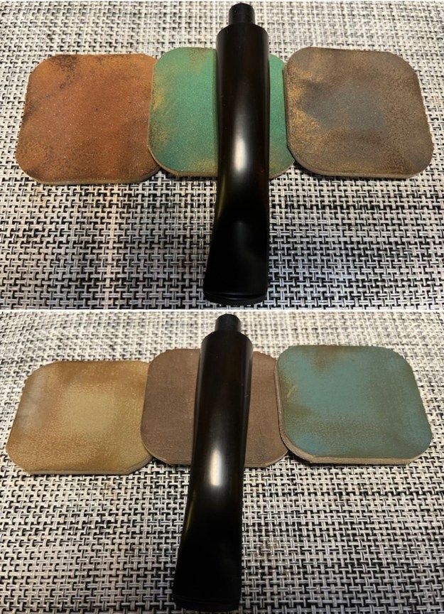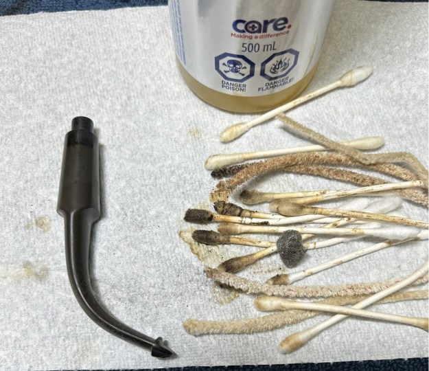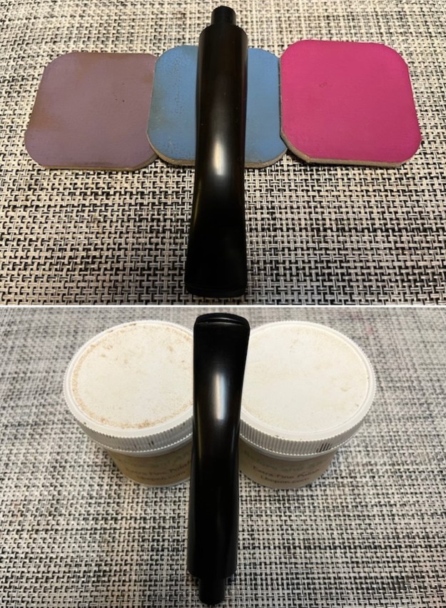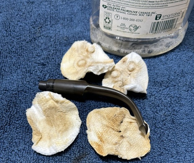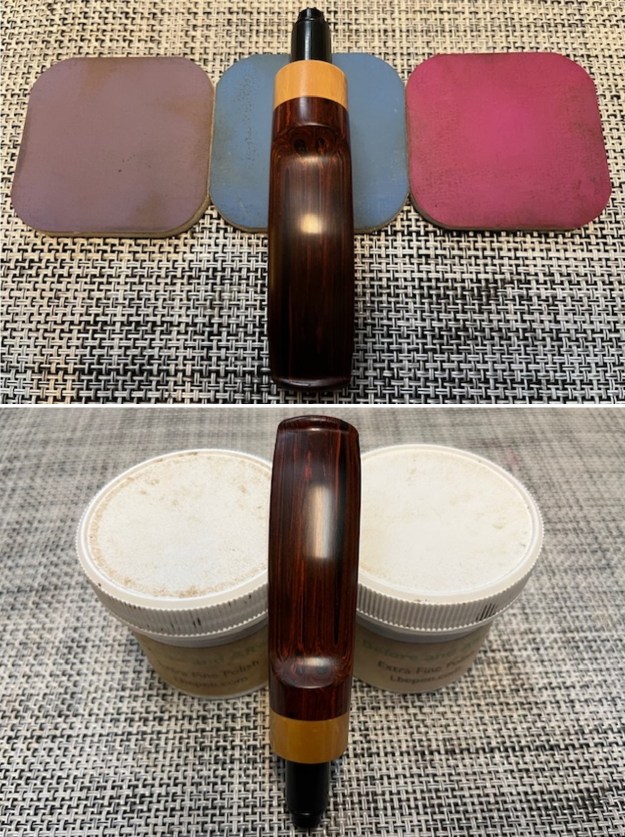 Following the alcohol soak, the stem was screwed back on. I used heat to lift some of the teeth indentions, but a few minor marks remain. I removed the oxidation with 800, 1,500 and 2,000 grade wet paper. The stem was then buffed with White Diamond rouge and Meguiars plastic polish.