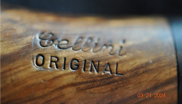 The next pipe on the table is a Freehand with some rustication at the shank/bowl joint and plateau on the rim top.  It has a well shaped thick vulcanite taper stem. We purchased it from an estate sale in Idaho Falls, Idaho, USA on 09/16/2023. The pipe is stamped on the left side of the shank and reads Cellini [over] Original. There is no other stamping on the bowl or shank. There was a thick cake in the bowl and some darkening and lava on the inner edge of the bowl and the first part of the plateau rim top. It was hard to know for certain the condition of the inner edge though it appeared to be in good condition. There were oils and grime ground into the bowl sides gives the finish a flat look though there is some great grain. The shank is thick and has a slight curve to it giving the pipe the appearance of a pick axe. The shape of the taper stem also matches the curves of the bowl and shank. It is a dirty stem with calcification, oxidation, grime and grit on the surface. There were also light tooth marks on both the top and underside of the stem just ahead of the button. Jeff took photos of the pipe before he started his clean up work. I have included them below.He took photos of the pipe’s bowl and rim top to show the cake in the bowl, the darkening on the inner edge and the lava coat overflowing onto the top. There are some oil stains on the rim top in various spots among the plateau finish. It is another dirty pipe. He also took photos to capture the oxidation, calcification and the light tooth marks on the top and underside of the stem near the button. He took photos of the sides and heel of the bowl to show the grain around the bowl and the amount of grime ground into the surface of the briar. He took a photo of the stamping on the left side of the shank. It is clear and quite readable. I turned to Pipephil’s site (http://pipephil.eu/logos/en/logo-c3.html) for a summary of the information he had gathered on the brand and perhaps some photos. I have included both the information from the sidebar as well as a screen capture of some photos. I quote: