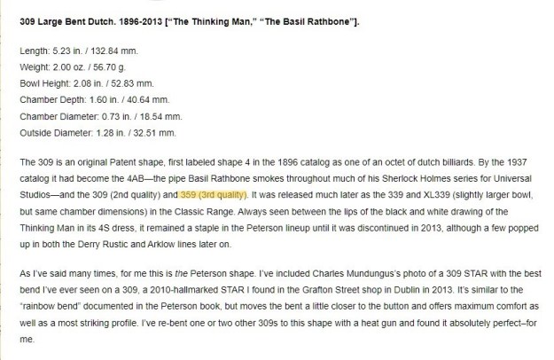 As usual, I also owe a debt of gratitude to Mark Irwin of Peterson Pipe Notes. He has a very interesting article on the various System shapes and I highly recommend having a look: https://petersonpipenotes.org/146-a-guide-to-system-shapes-1896-2019-part-1-the-300-shape-group/. Here is a screenshot of the relevant bit:In addition, Mark has an article on an older 359 that he picked up: https://petersonpipenotes.org/tag/peterson-359-system/.