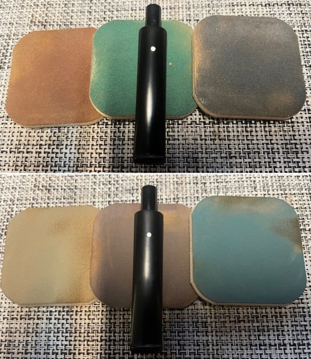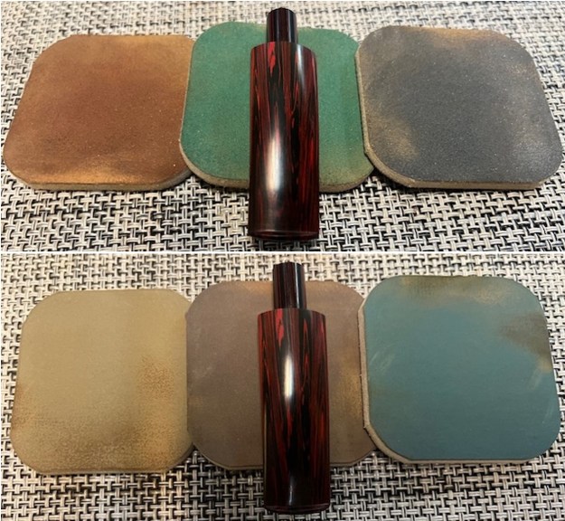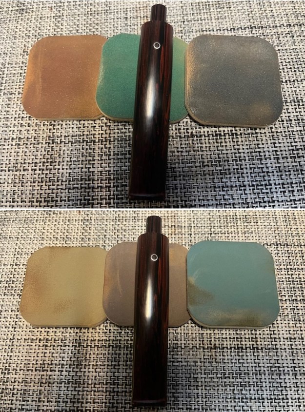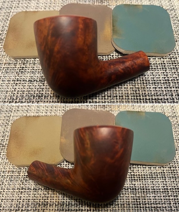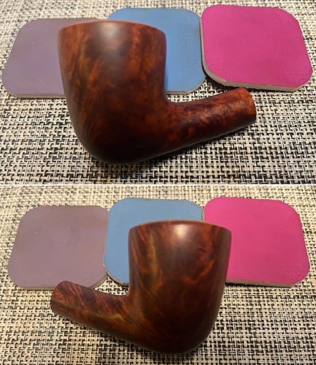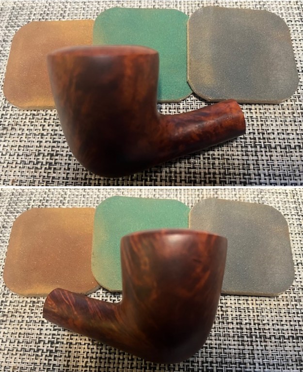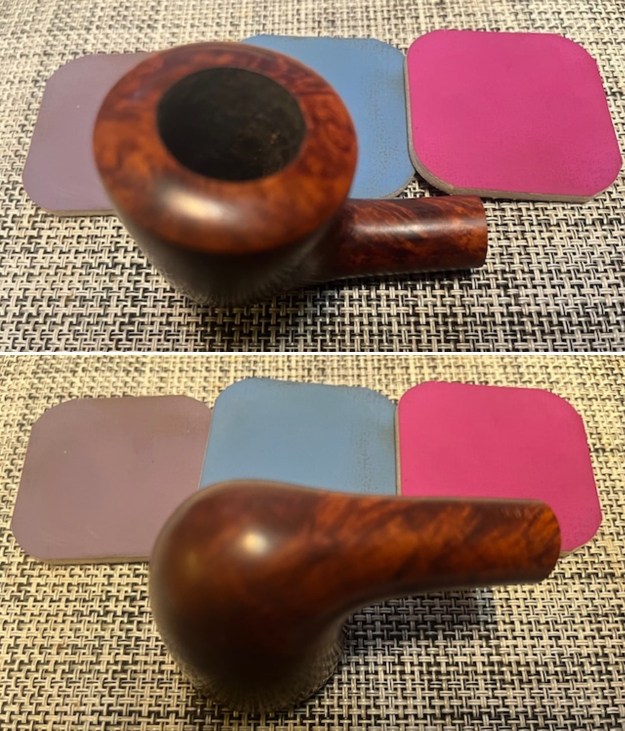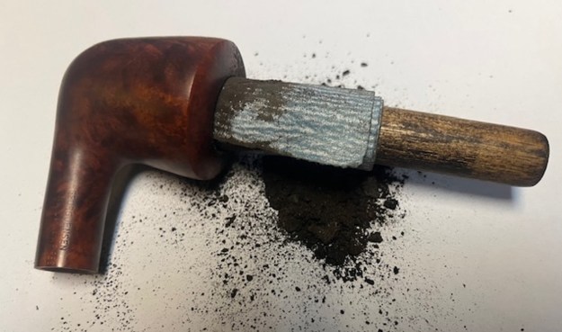 With the stem repairs set aside, I addressed the rim top darkening and unevenness by topping the surface on a piece of 220 grit sandpaper. I frequently checked the progress being made as I hate to lose briar more than what is absolutely necessary. The chamber now appears more out of round than before and would be addressed by creating a bevel over the inner rim edge.