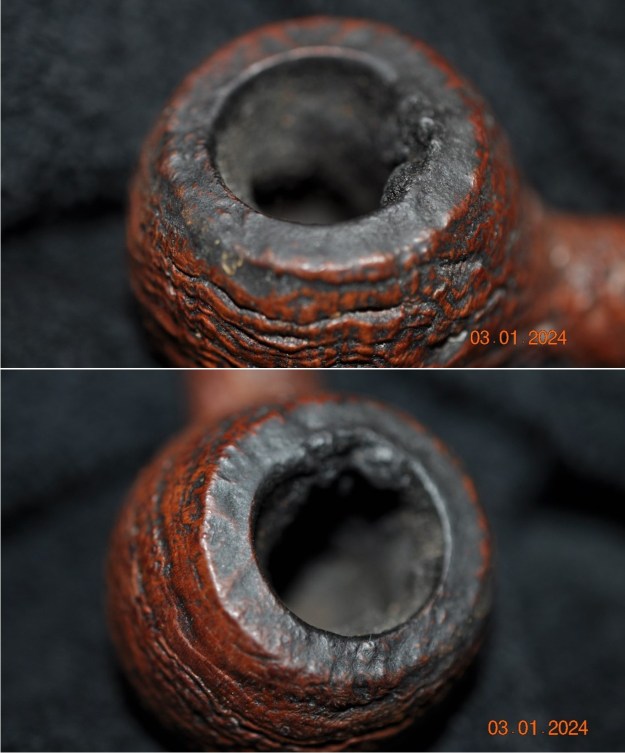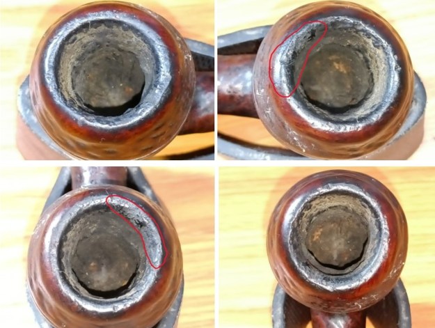 The chamber has a decent layer of uneven cake and has a strong residual pungent smell of Latakia forward blend of tobacco. There is thick overflow of tobacco oils, ash and grime over the rim top surface that spills over to the sides of the bowl. The condition of the outer rim edge can be ascertained only after the rim surface is rid of complete lava overflow. However, that the inner rim edge has damage is visible through the grime. The rim surface has thinned out (encircled in yellow) in 12 and 3 o’clock due to removal of charred edge by the erstwhile individual who held the pipe in his/ her trust. Any other issues with the inner rim edge will be known after the rim top surface has been cleaned. The draught hole is at the bottom centre of the chamber and thus should be a decent smoker.