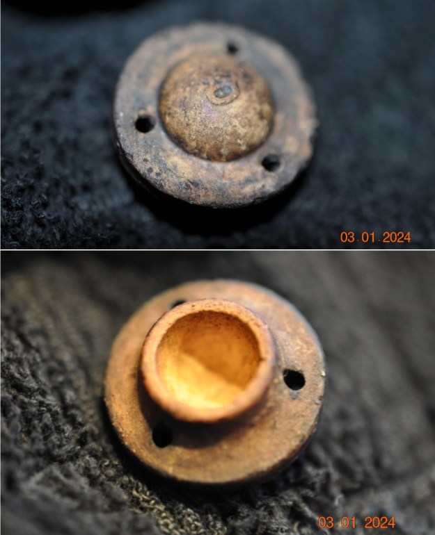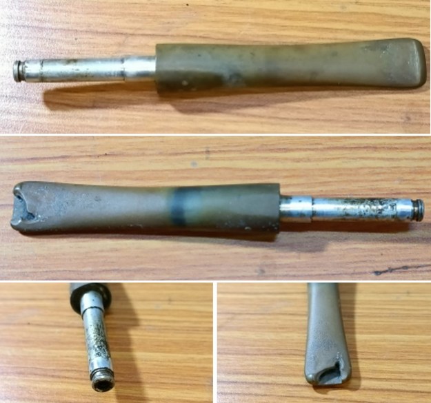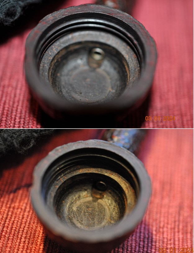 As I was cleaning the shank internals, the metal band came loose from the shank end. Careful inspection of the now exposed shank end confirmed that the surface is sans any cracks or chips. I kept the band aside to be worked upon later.