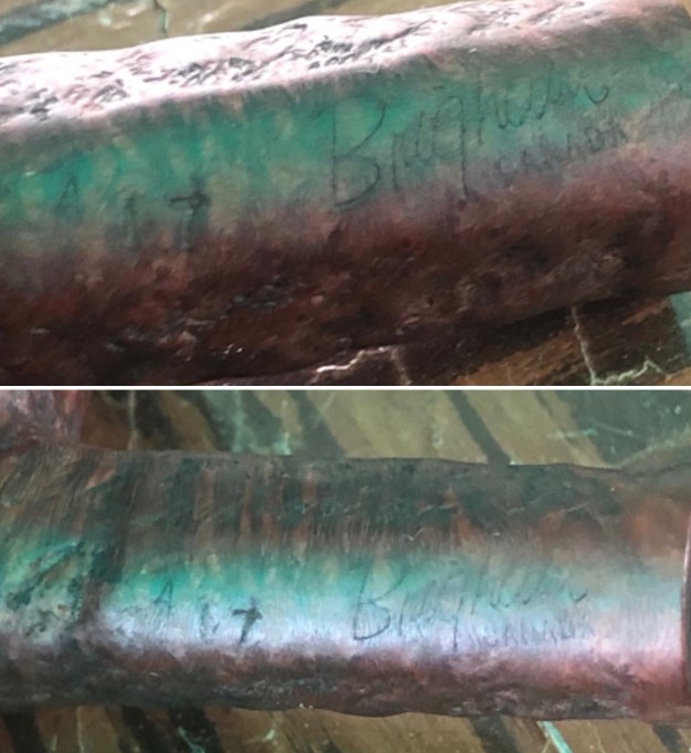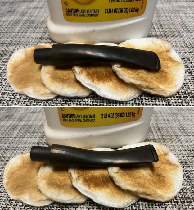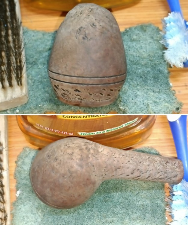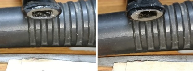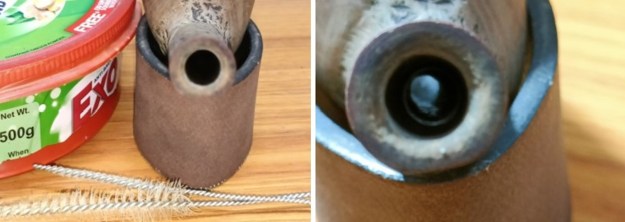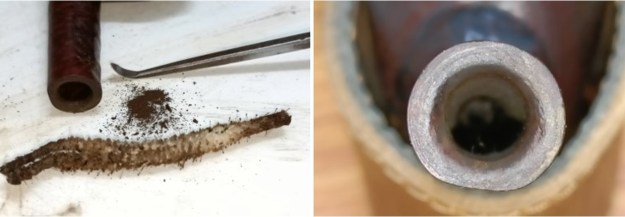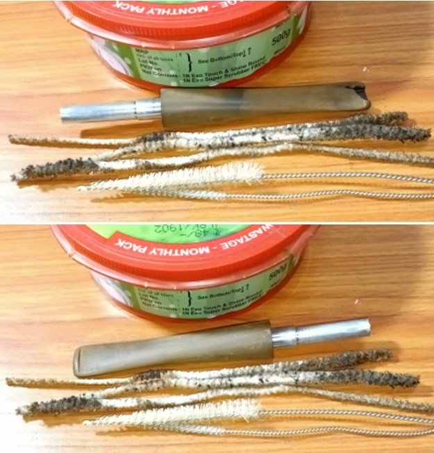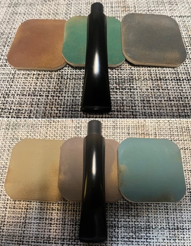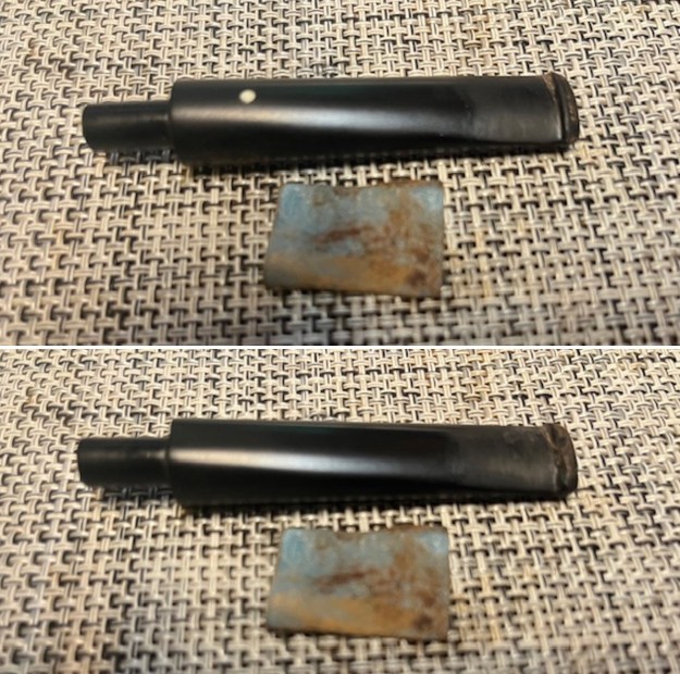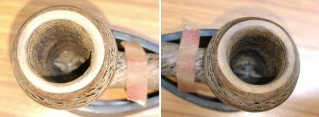 The next morning, I removed the stems that had been soaking in the deoxidizer solution overnight. I cleaned the stem surface and airway under running warm water and scrubbed the raised oxidation from the stem surface using a Scotch Brite pad and the airway with thin shank brush. I further removed the oxidation by scrubbing the stem with 0000 grade steel wool and applied a little olive oil to rehydrate the stem.