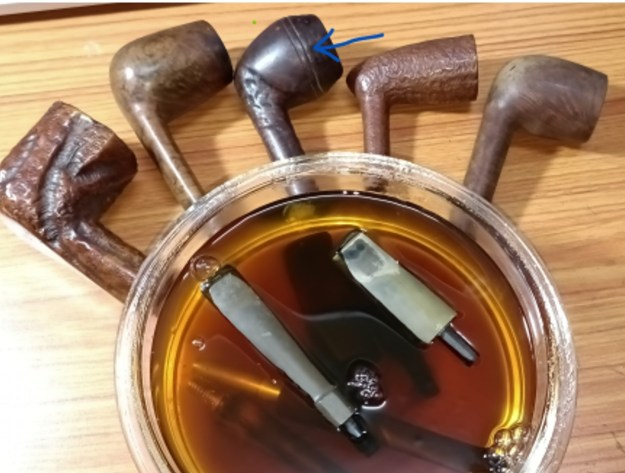 Once the stem internals had been cleaned, I immersed it in “Before and After Deoxidizer” solution along with the stem of other pipes in line for restoration. This solution has been developed by Mark Hoover and works to draw out all the deep seated oxidation from the surface making its subsequent cleaning and polishing a breeze. I would definitely recommend this product as it saves on to time and efforts. The pipe has been marked with a yellow arrow for easy identification.