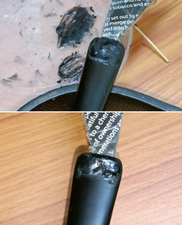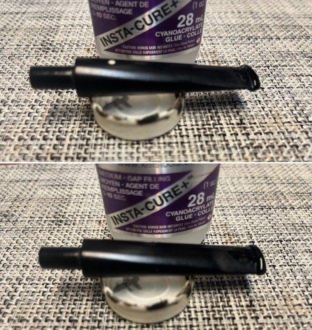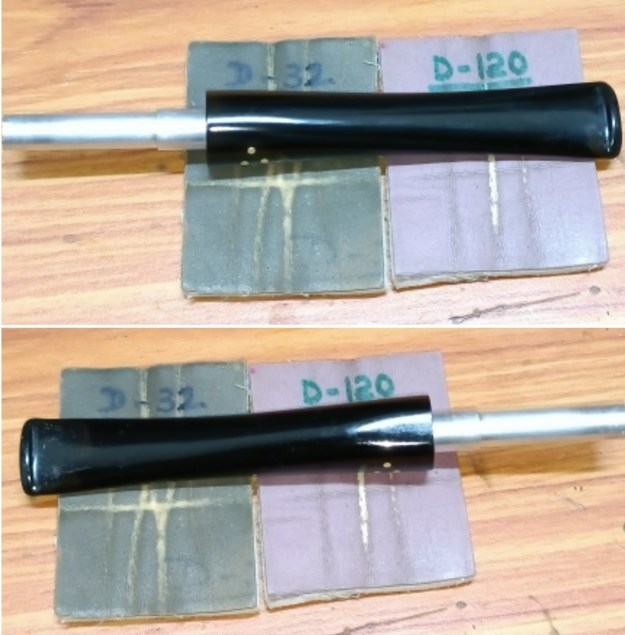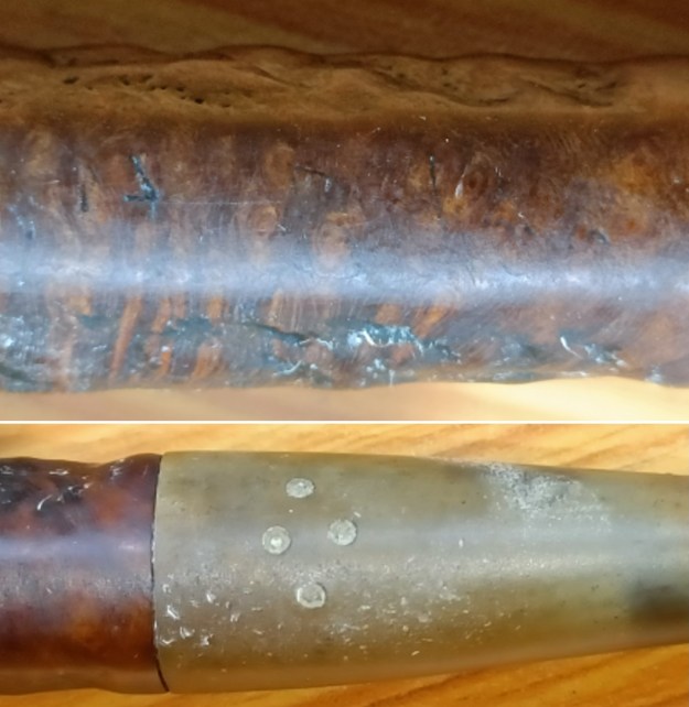 Continuing with the stem refurbishing, I heated the bite zone with the flame of a lighter to raise the tooth indentations to the surface. Though the results were not what were expected, the vulcanite was raised a little leaving behind two visible tooth compressions on either surfaces. The button edges and deeper tooth indentations on either surfaces of the stem were filled with a mix of CA Gorilla superglue and activated charcoal powder and set aside for the fill to cure.