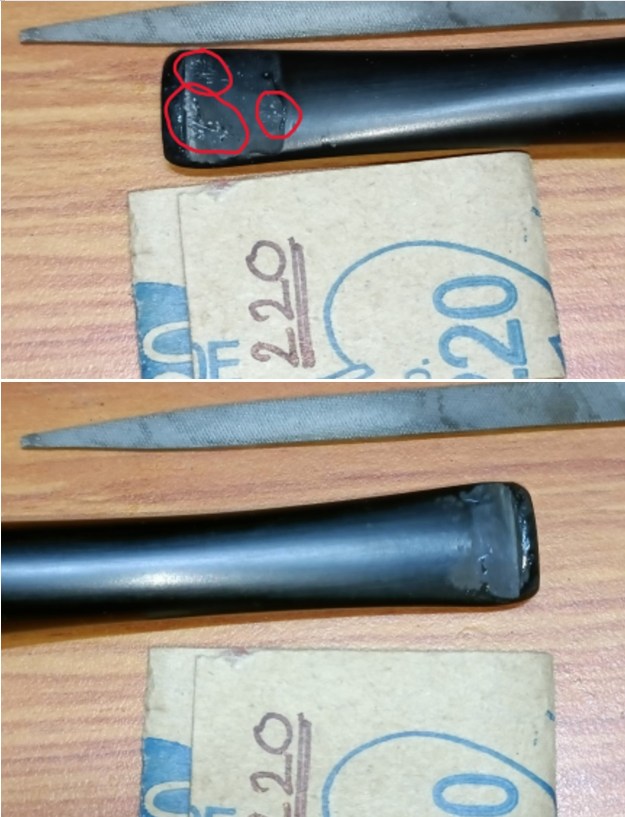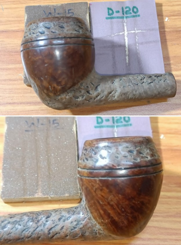 Next, I filled the deep gouge to the front of the stummel with a mix of briar dust and superglue. This mix hardens very rapidly and invariably reveals air pockets when sanded. To mitigate this, one has to re-patch the fill and this is exactly what I followed. Using a flat needle file, I sanded the patch to achieve a rough match of the fill with the rest of the stummel surface. I further evened out the patch with a folded piece of 220 grit sandpaper. I am quite satisfied with the appearance of the stummel surface at this point in restoration.