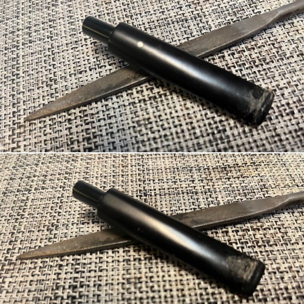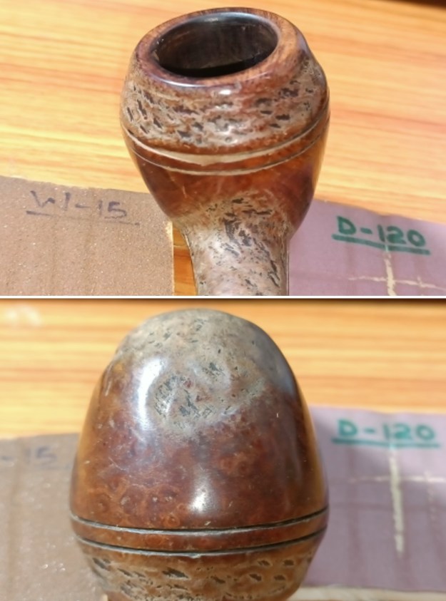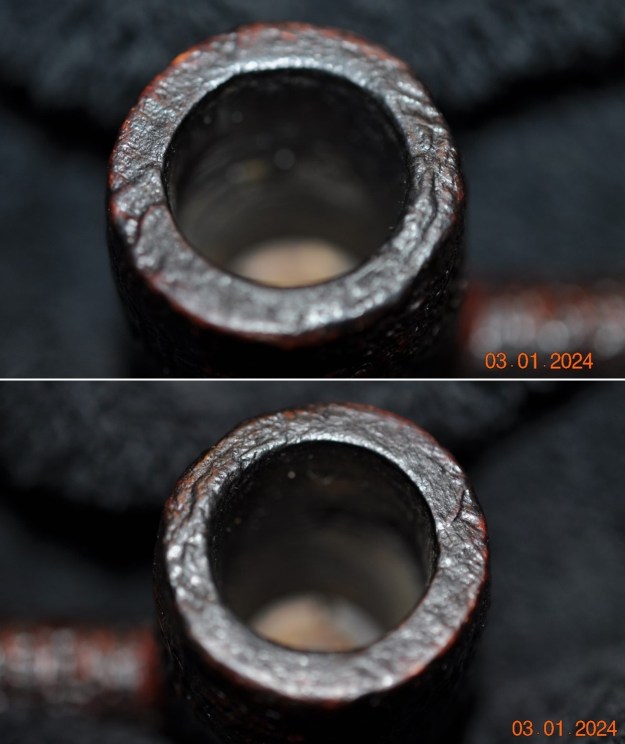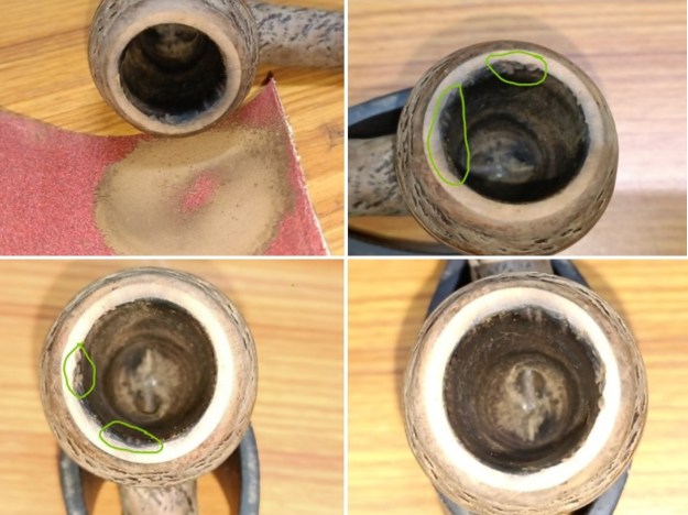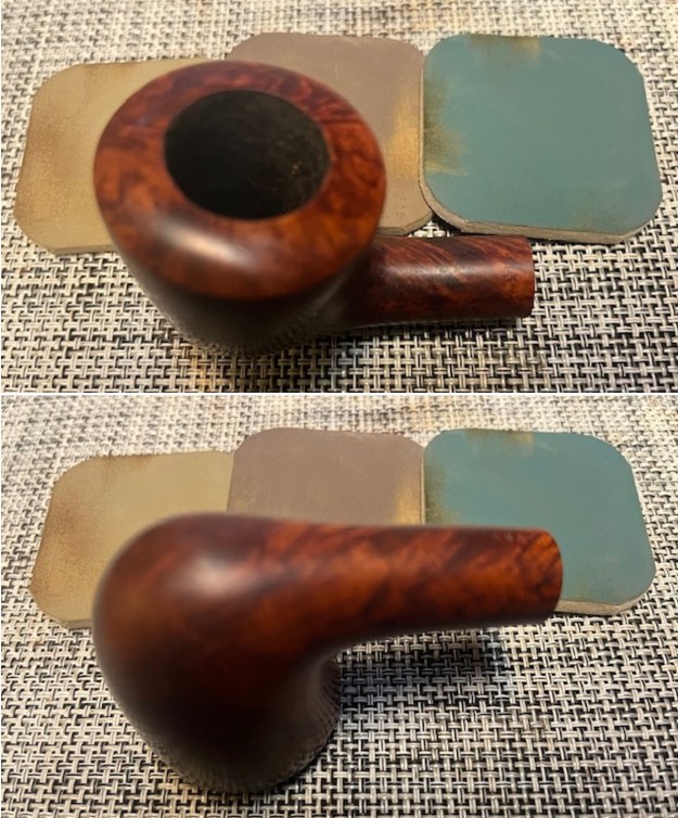 With a folded piece of 220 grit sandpaper pinched between my forefinger and thumb, I imparted a nice bevel to the inner rim edge. This masked the out of round appearance of the chamber and also eliminated the minor charring over the edges. I evened out the outer rim edge n the same way. The rim top surface now has a nice rounded appearance with even rim edges.