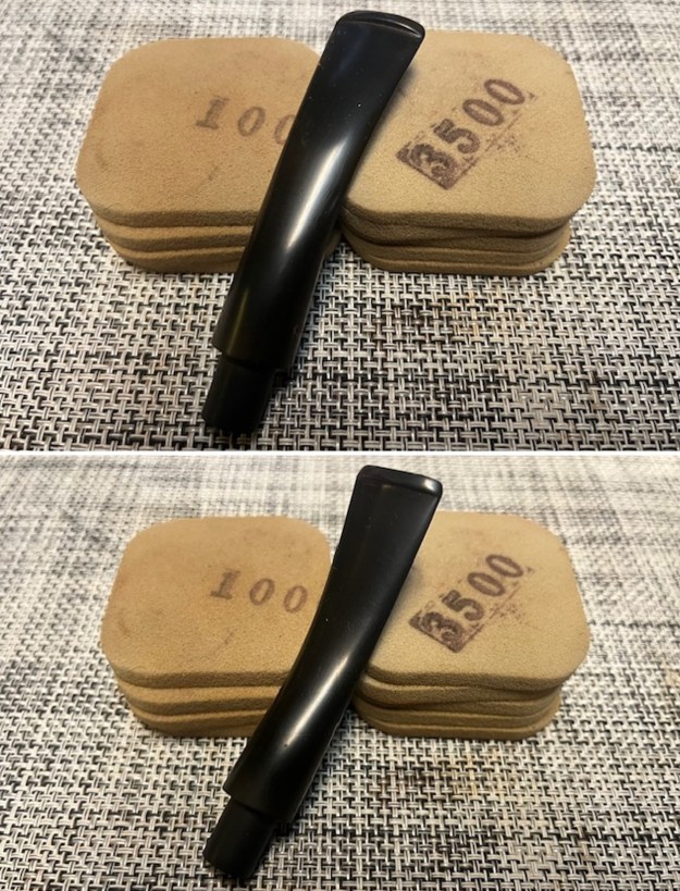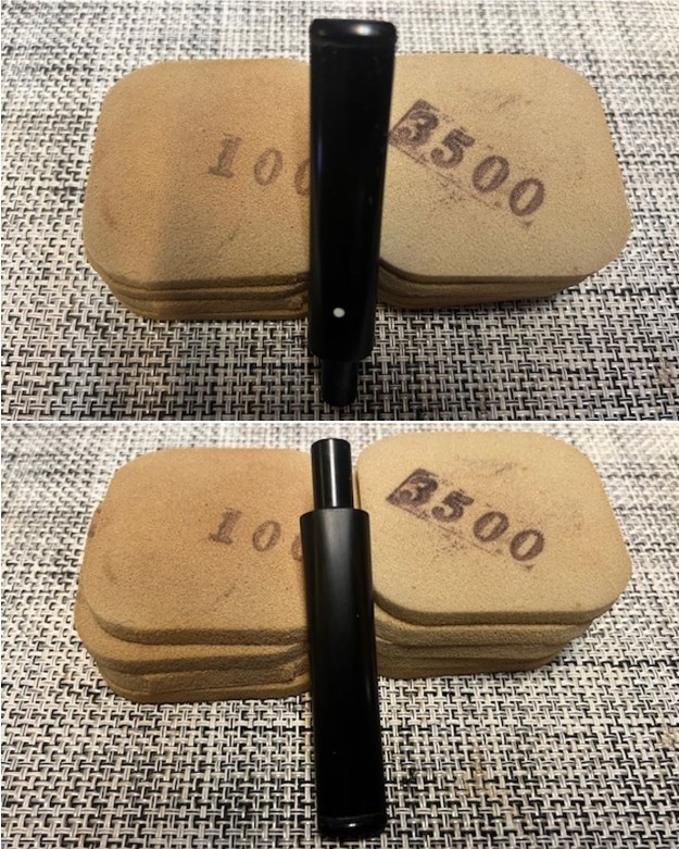 I followed it up by wet sanding the entire stem surface using 400, 600, 800, 1000, 1500 and finally with a piece of 2000 grit sand paper. This serves to reduce the sanding marks of the more abrasive sand papers. I also sharpened the button edges while sanding. I wiped the stem with a moist cotton swab to remove all the oxidation and sanding dust from the surface. I applied a little Extra Virgin Olive oil over the stem and set it aside to be absorbed by the vulcanite.