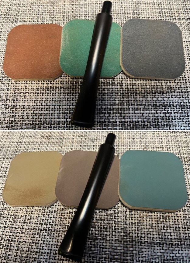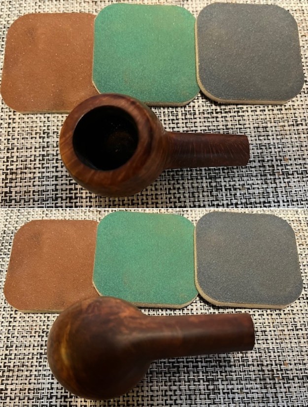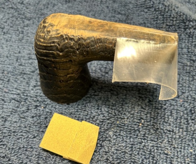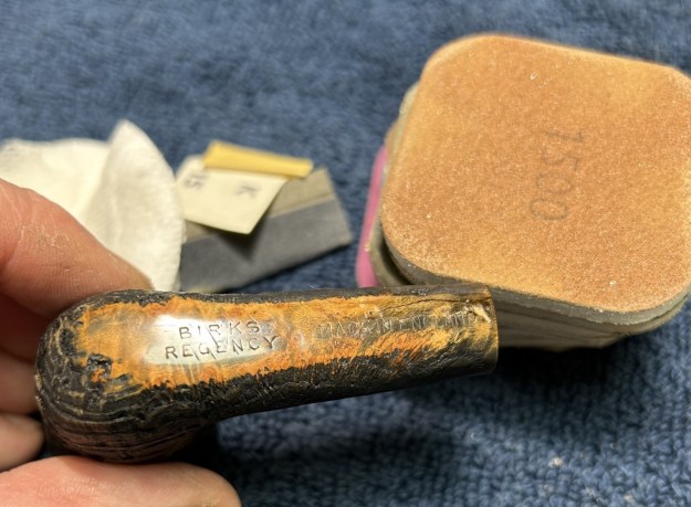 After the adhesive cured on the shank, I set about sanding the underside of the stummel because there were a lot of scratches there. I also needed to sand down the bead of adhesive that I put there. It was tricky, because there wasn’t much room to move, with the markings so nearby. I started out by masking those markings with hockey tape, which is a perfect masking material as it is extremely scratch resistant. However, it ended up being more trouble than it was worth given the tight spaces to work in. Instead, I just sanded the area down, freehand, so to speak.