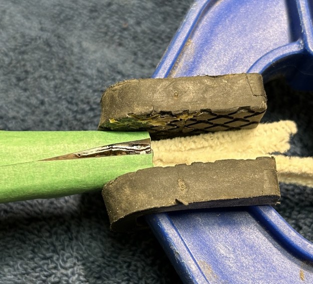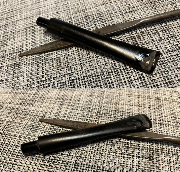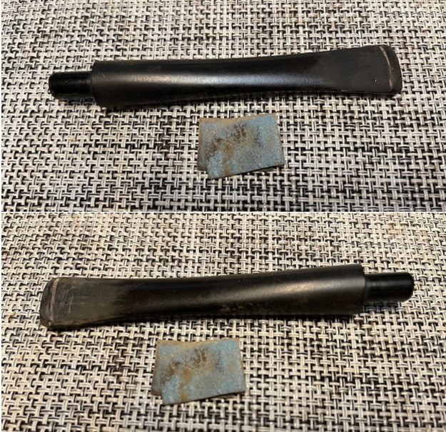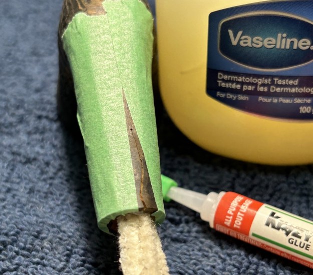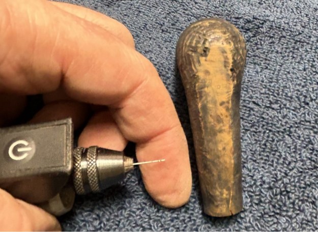 Let’s move onto the primary repair to this pipe: that crack in the shank. First of all, I took the most micro of micro drill bits and drilled a hole with my Dremel right through the shank wall into the airway. This is an important step as it stops the crack from extending later on in life. The drill bit is so thin that it’s always a bit nerve-racking, because I fear snapping the bit through such hardwood. Fortunately, it worked like a charm this time. I also stuffed the mortice with pipe cleaners coated in Vaseline, so that if – God forbid – any cyanoacrylate adhesive drip into the mortise, it can be easily removed by the petroleum jelly. I ran a thin bead of cyanoacrylate adhesive along the length of the crack, and then held the two sides of the crack together with some vice grips. I let it sit for a few hours to cure.