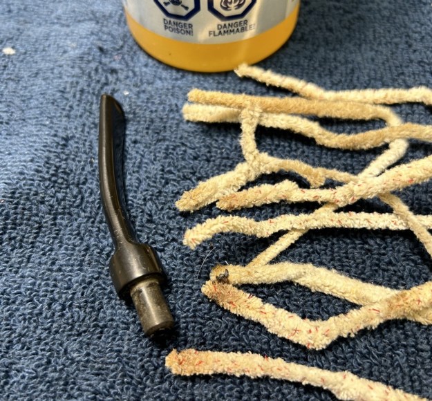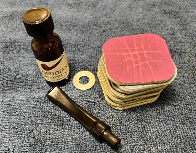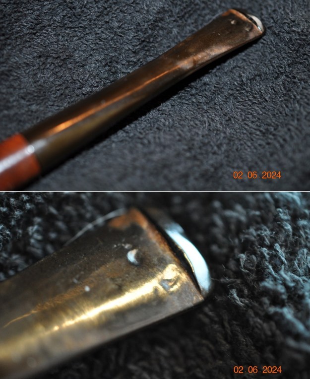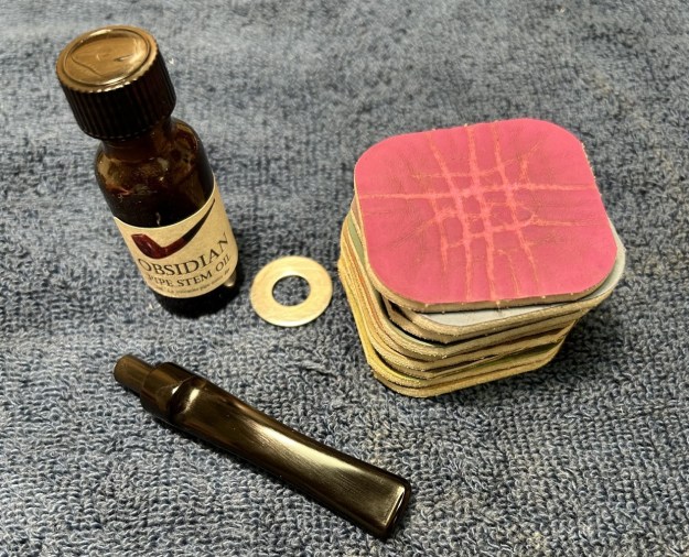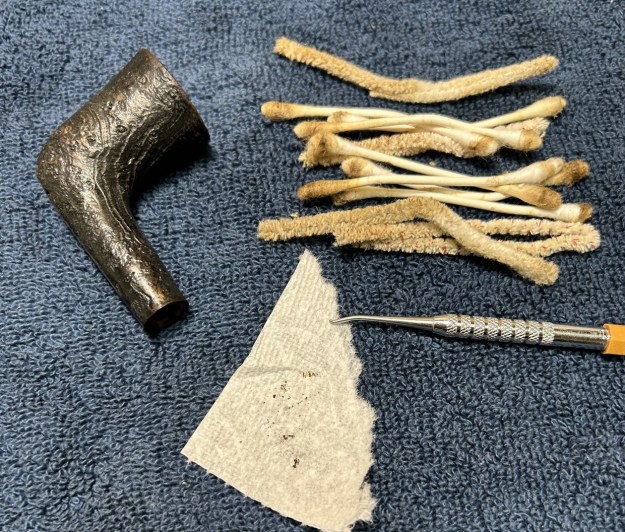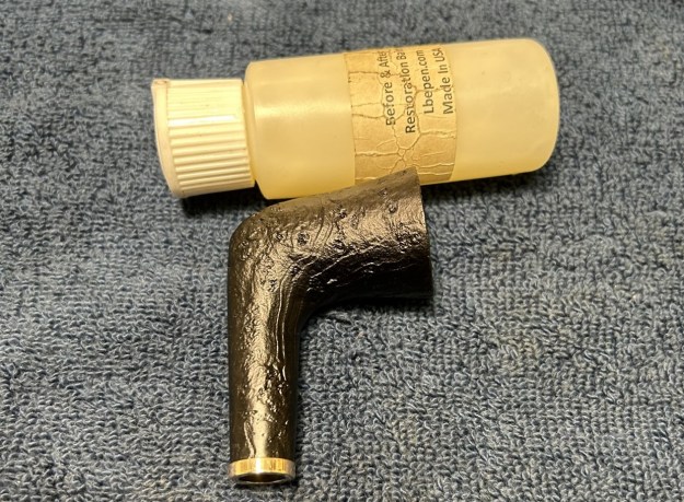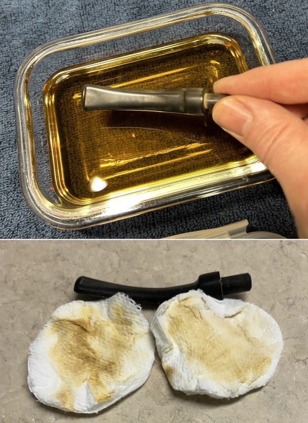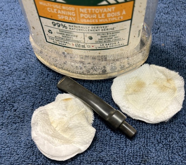 Moving along to the stem. Like the stummel, it was also quite clean, but needed a few more pipe cleaners to finish the job. Of course, I used isopropyl alcohol with them. I then wiped down the stem with Murphy’s on a cotton round. Once done, I put the stem in the deoxidizing fluid, even though there wasn’t much oxidation to speak of. It can’t hurt, and it’ll remove what little there is.