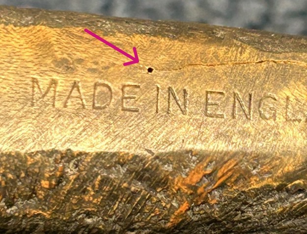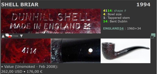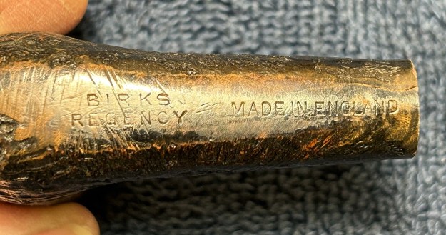 Two further points about this. First, I wonder if Wilczak and Colwell were thinking of an English razor company (also called Birks) that frequently used a maker’s mark that was in the shape of a pipe (rather unhelpfully). For more on that, click here. Second (as I mentioned earlier), this particular pipe has the word Regency on it. Regency specifically refers to a Henry Birks line of silverware, china, etc. – so that makes sense.