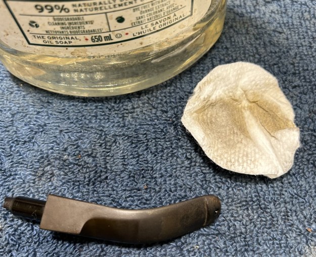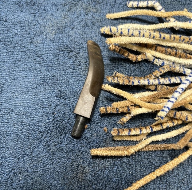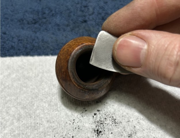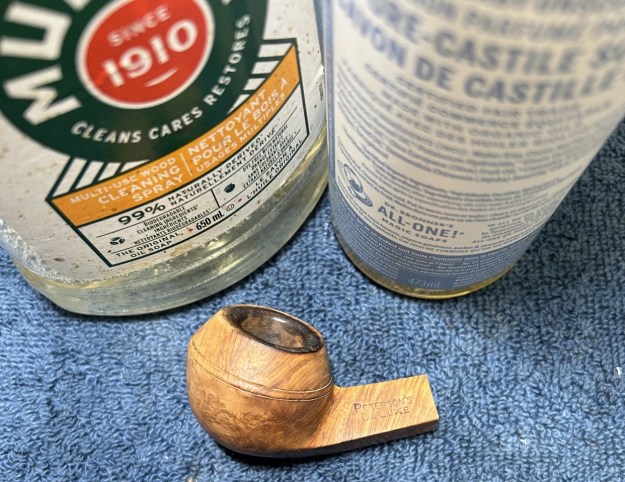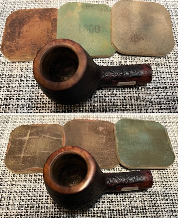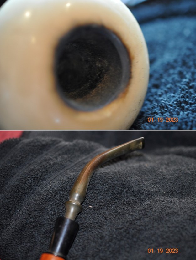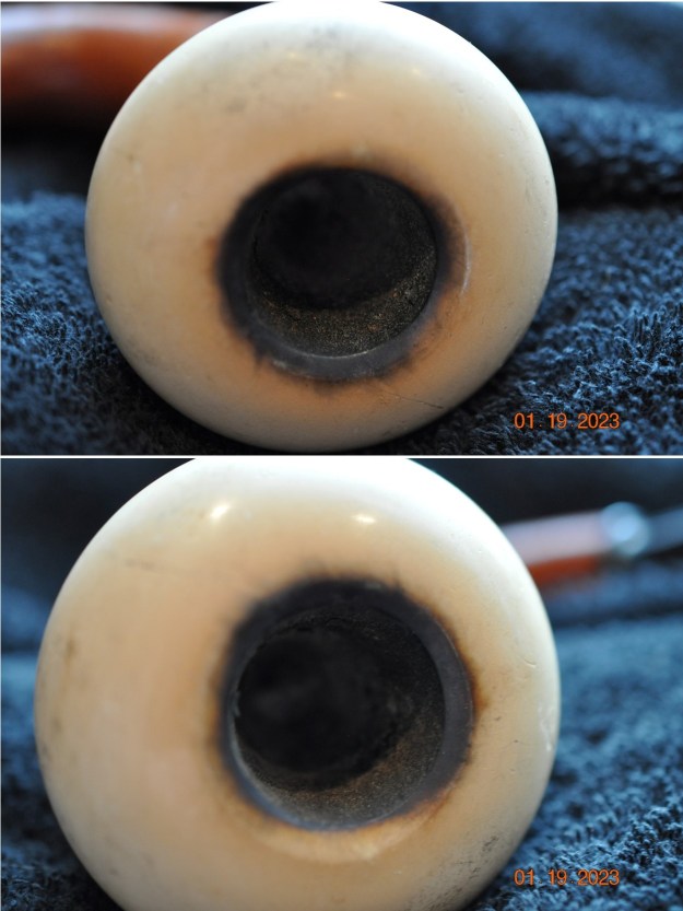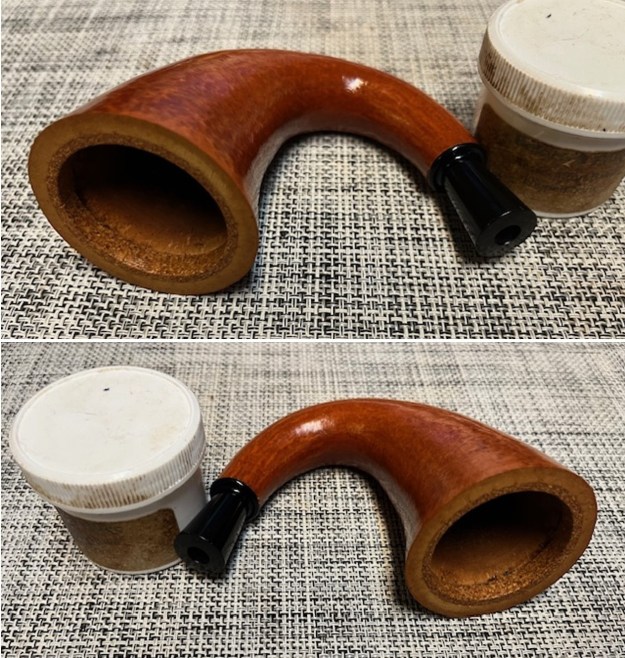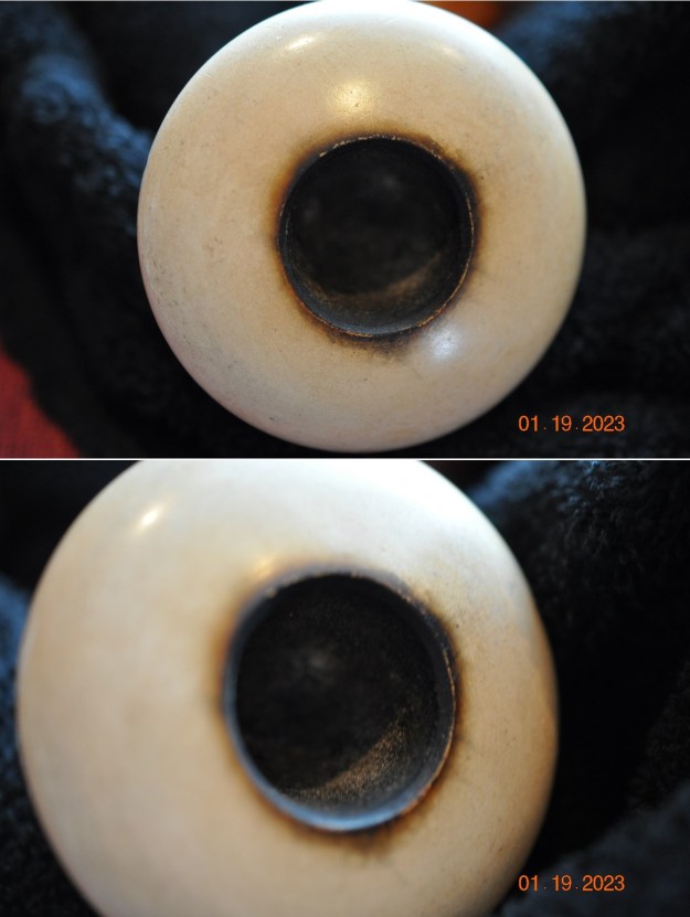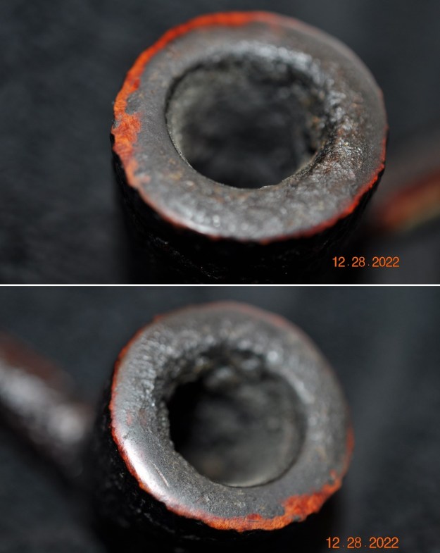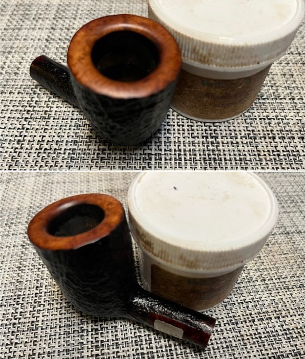 Jeff had done a great job cleaning up the pipe as usual. He reamed the pipe with a PipNet reamer and cut back the cake back to the bare briar. He cleaned up the walls with a Savinelli Fitsall Pipe Knife. He scrubbed the interior of the bowl and shank with pipe cleaners, cotton swabs and alcohol to remove the tars and oils. He scrubbed the exterior of the pipe with Murphy’s Oil Soap and a tooth brush to remove the grime from the finish. He worked on the rim top lava and darkening with the soap and tooth brush. He scrubbed the inside of the stem with alcohol and pipe cleaners. He scrubbed the exterior with Soft Scrub and then soaked it in Briarville’s Pipe Stem Deoxidizer. He washed it off with warm water to remove the Deoxidizer. The pipe looked far better when it arrived.