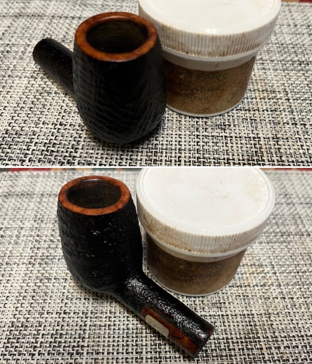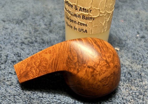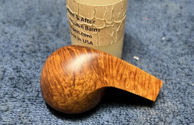 I rubbed the briar down with Before & After Restoration Balm. I worked it into the briar with my fingertips. The product works to clean, enliven and preserve the briar. I let it sit for 10 minutes while I worked on the stem. After the time passed I buffed it with a cotton cloth to deepen the shine. The briar really comes alive with the balm.