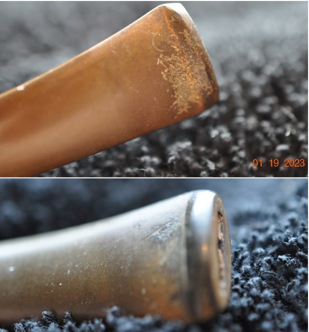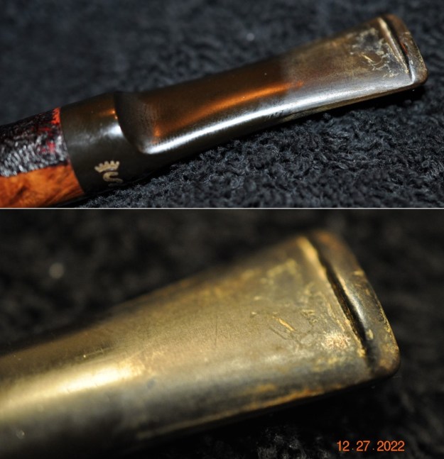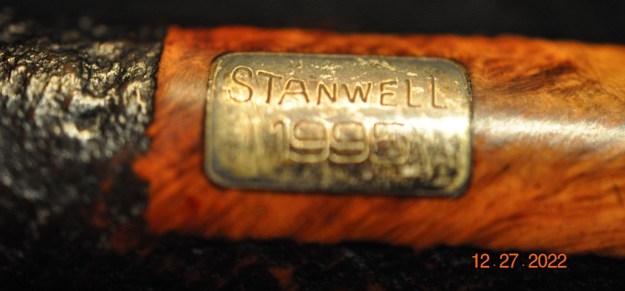The next photos show the various stamping on the sides of the shank. On the left side of the shank it reads Stanwell [over] Golden [over] Contrast in script on the right side it is stamped with the 02 Shape number and on the underside it reads Made in Denmark. All the stamping is sharp and clear. He also captured the heavily oxidized golden Crown “S” Stanwell logo on the left side of the taper stem.