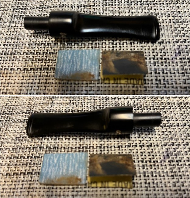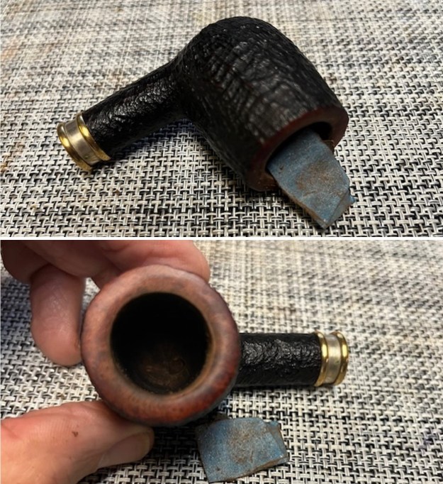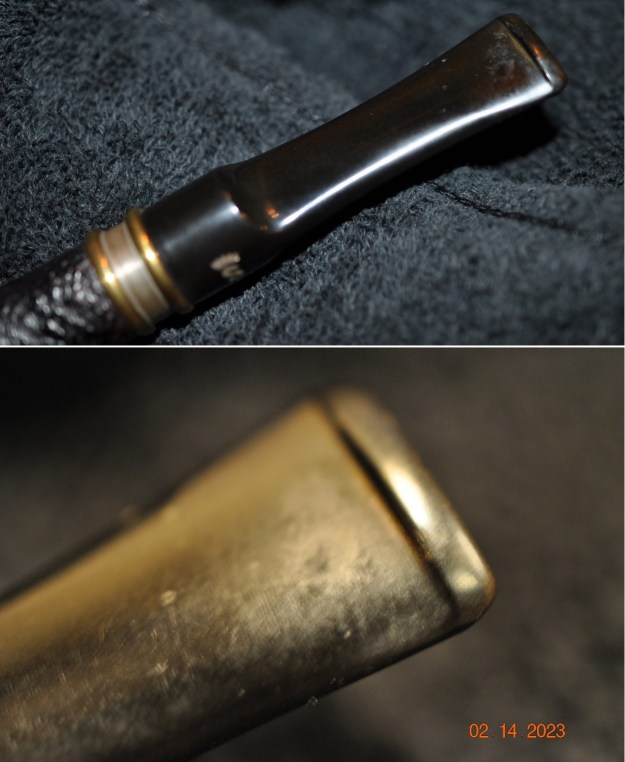 I took a photo of the rim top and the stem to show their condition once it arrived in Canada. Jeff was able to clean up the cake and the lava overflow that was shown in the rim and bowl photos above. The rim top looked very good but there seemed to be light damage and darkening to the inner edge of the bowl. The stem looked better, though there were light tooth marks and chatter on both sides near the button. The bend in the stem would need to be corrected as well as it had straightened slightly.