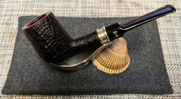 The next pipe I am working on was purchased on 12/13/2022 as part of a group of pipes from a fellow in Copenhagen, Denmark. This was a dirty pipe with a lot of wear and tear and obviously it had been someone’s favourite smoker. The pipe has an identifying plate on the left side of the shank that reads Stanwell [over] 1986. There was no other stamping on the shank and the silver plate confirmed for me that it was a Stanwell Pipe of the Year. The dirty sandblast finish was not able to hide the beauty in the grime. There were tars and oils ground into the surface of the briar. The bowl had a moderate cake that flowed over the top of the lightly crowned rim in a spotty coat of a lava and it was hard to assess the condition of the inner edge. The stem was a black vulcanite saddle stem with a silver Crown S on the left side of the saddle. It had some tooth marks and chatter on both sides ahead of the button. There was also some oxidation and calcification on both sides of the stem. It had a lot of potential. Jeff took photos of the pipes before he started his clean up work.
