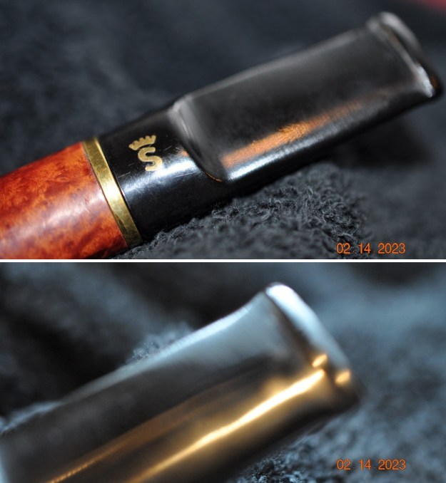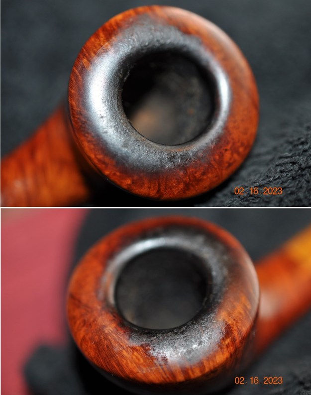 Jeff took photos of the rim and bowl to show the moderate cake and spotty lava coat covering the rim top. It really was a dirty pipe but still a beauty. He also took photos of the stem surfaces to show its overall condition when it arrived.