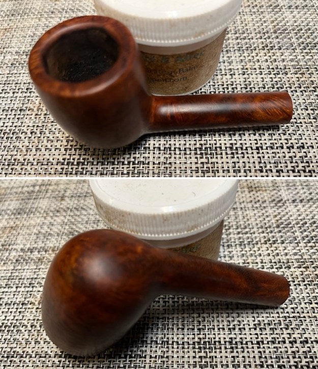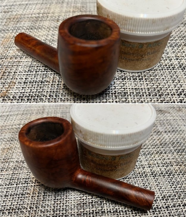 I did not need to restain the rim top and edge because with polishing the match is very good. I rubbed the bowl down with Before & After Restoration Balm. I worked it into the surface of the bowl sides and shank with my fingertips. The product works to clean, enliven and protect the briar. I let the balm sit for a little while and then buffed with a cotton cloth to raise the shine.