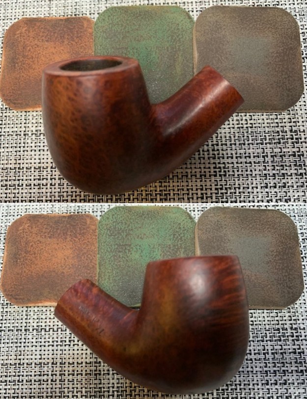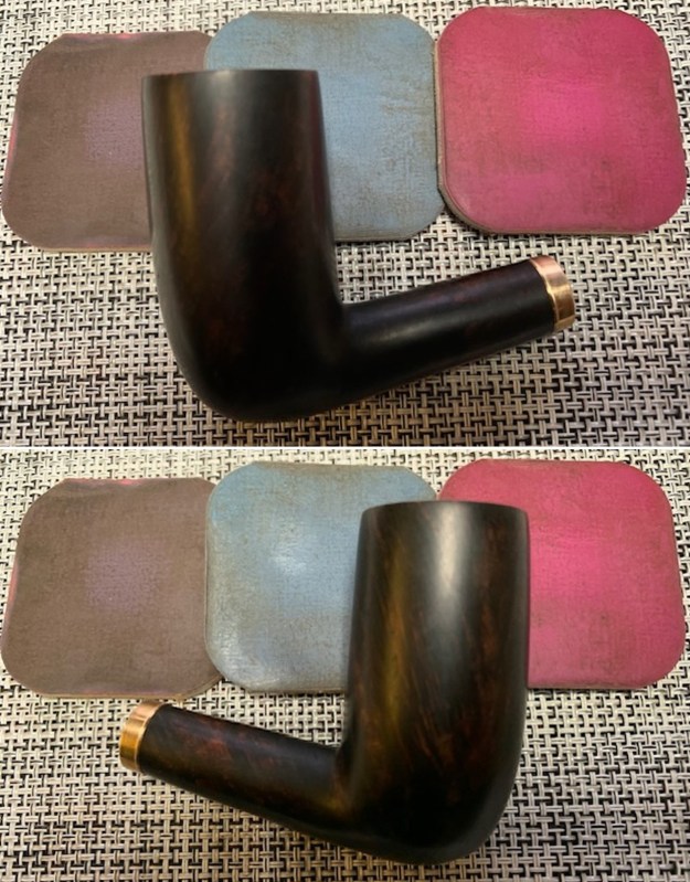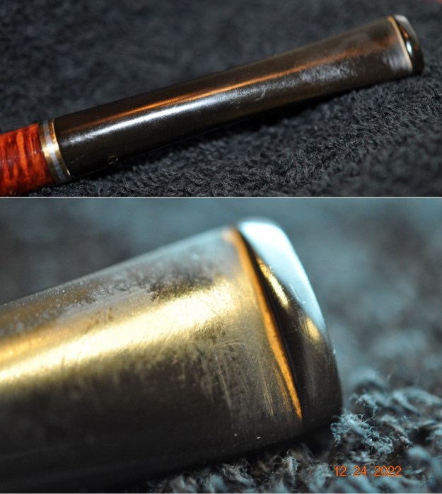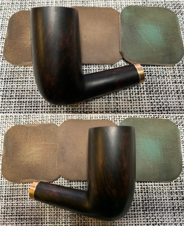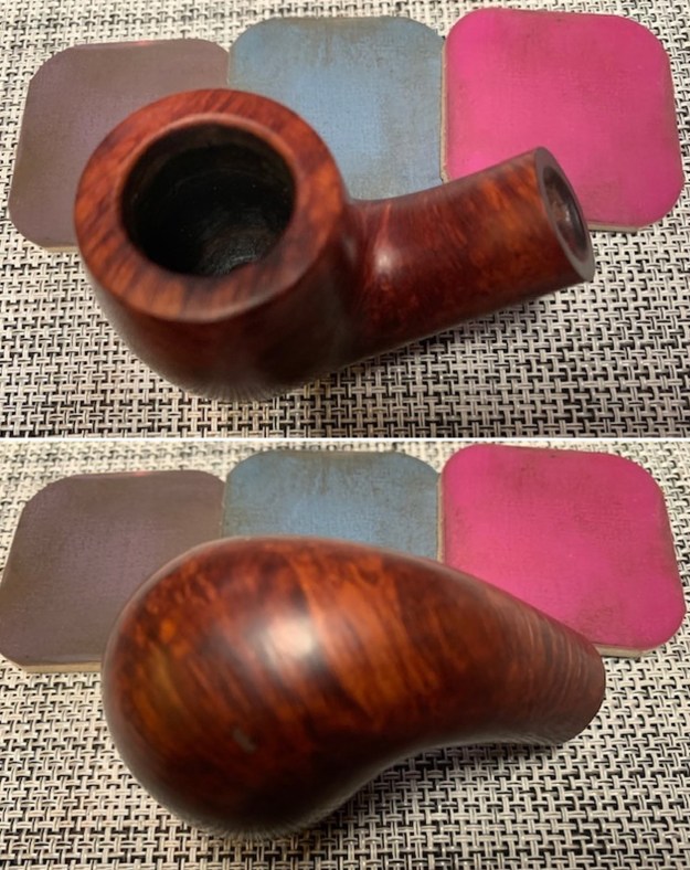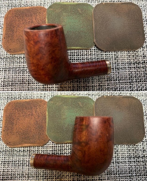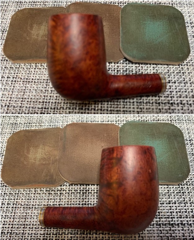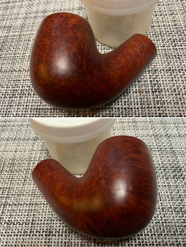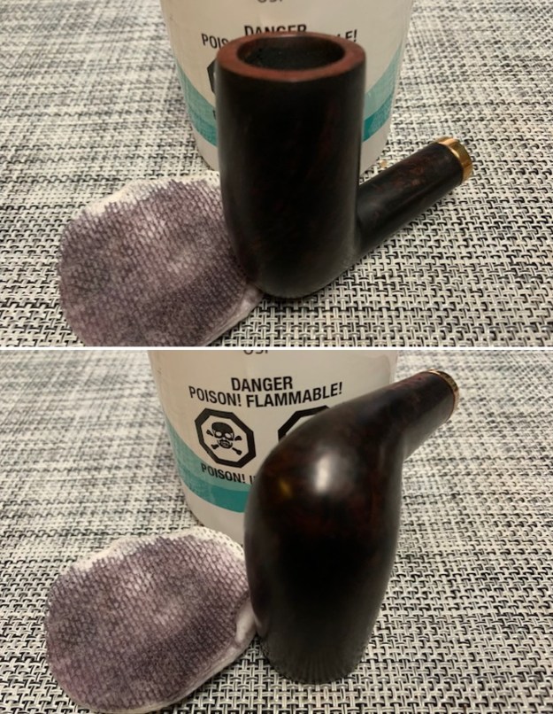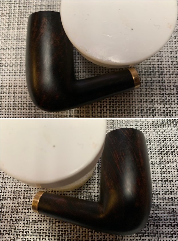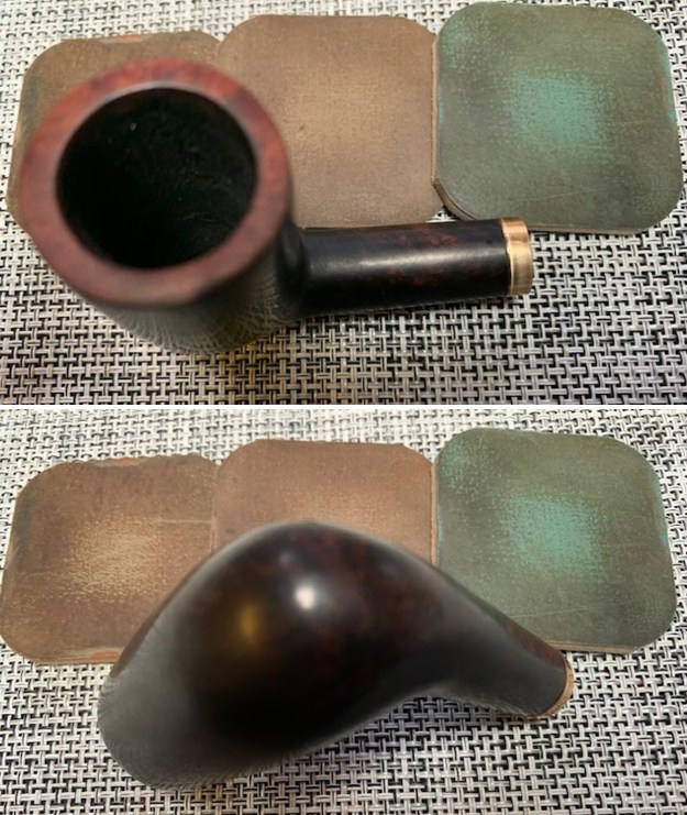 The rim was so badly scratched that I had to “top” the pipe – that is, I gently and evenly sanded the rim on a piece of 220-grit sandpaper. This effectively removed the damage without altering the look of the pipe.