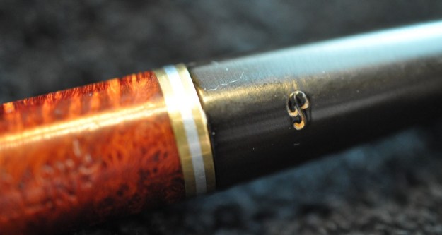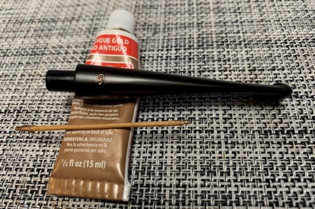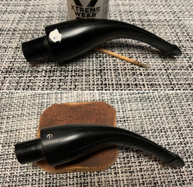 I set the bowl aside and touched up the “P” logo stamp on the left side of the taper stem with Rub’n Buff Antique Gold. I worked it into the stamp with a toothpick. I buffed off the excess with a paper towel and polished the stem with some Obsidian Oil.