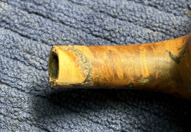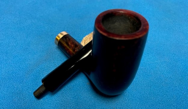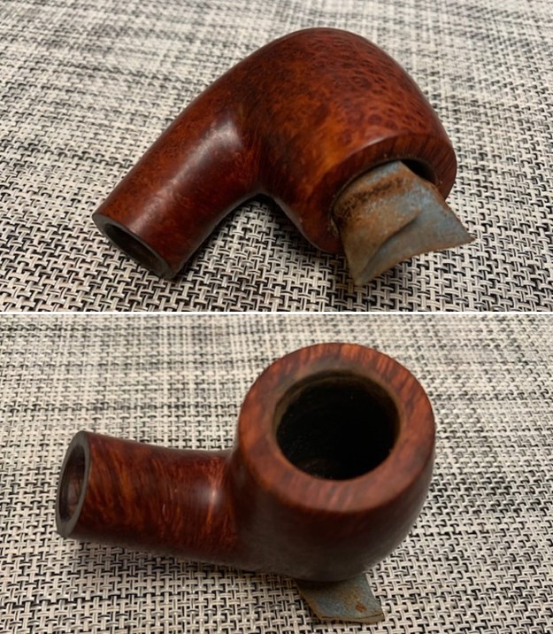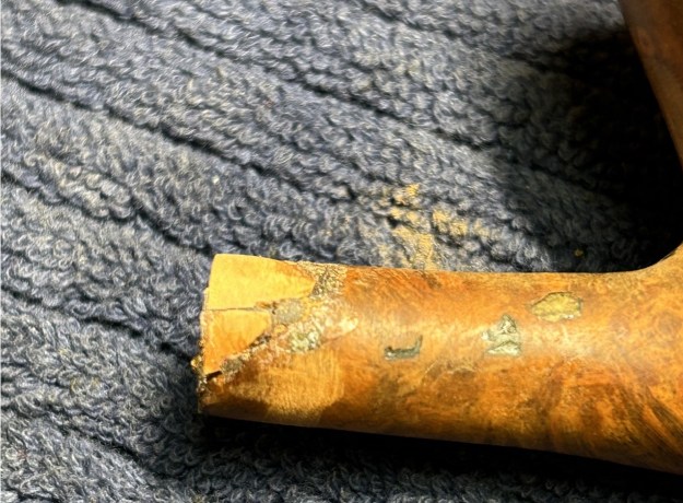 You can see what the problem is. My guess is that the shank was broken when the stem was removed from it at an inopportune moment. The tenon on the stem is an odd metal thing, which I suspect might be a replacement. The tenon and mortise certainly don’t fit together very well. Regardless, the tenon needs to be repaired in a manner that is both structurally sound and aesthetically pleasing.