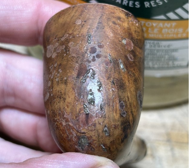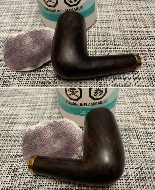 I set the stem aside and turned my attention to the bowl. I wiped the bowl down with isopropyl alcohol on a cotton pad to make the stain a bit more transparent so the grain showed through.
