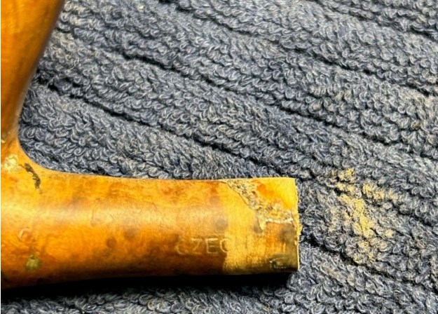 The pipe is a no-name churchwarden (with the word “Czech” along the shank) and it had clearly been through the wars. Not literally, of course, but this pipe was smoked hard! The old fellow must have loved this pipe and it must have smoked well. The stummel was full of cake, lava erupting on the rim, and fills everywhere – in fact, I counted no fewer than 39 fills. Anyway, let’s take a closer look at the shank.