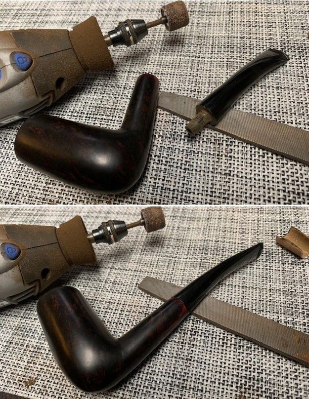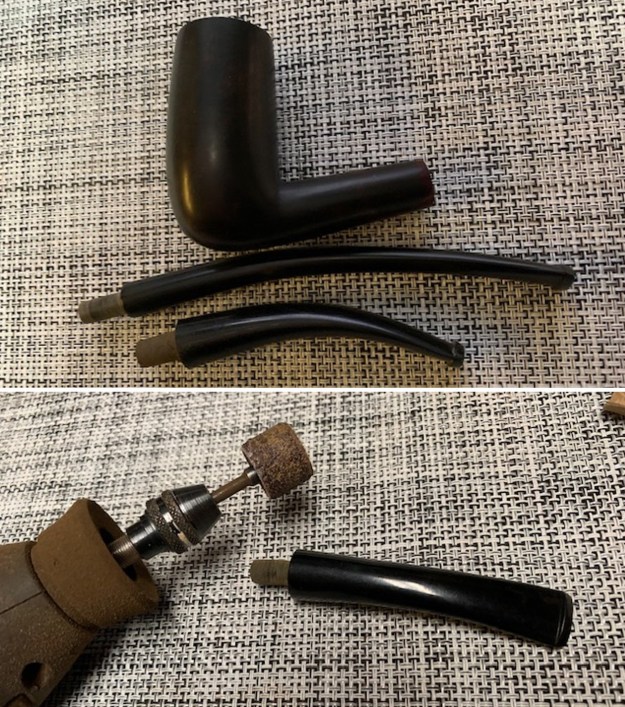 I went through my can of stems until I found the one that fit the angles and the diameter of the shank. I used a Dremel and sanding drum and a file to reduce the diameter of the tenon on the new stem to fit the shank.