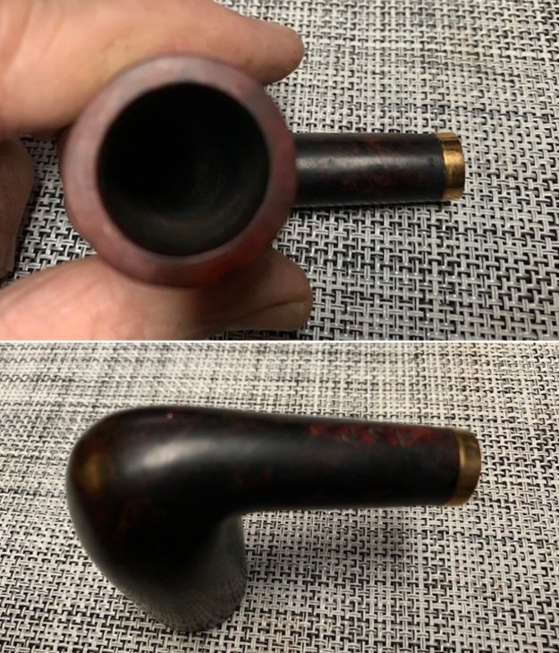 Clearly, this particular pipe had been well-loved, as it arrived well worn, with plenty of filth inside, a few dents in the work, gouges in the horn stem, and scratches all over the rim. Interestingly, this pipe had an orific button at the end of the stem, a feature that apparently disappeared by the 1930s, so it must be around a hundred years old. For more information on the orific button, take the time to read Steve’s interesting article on the subject.