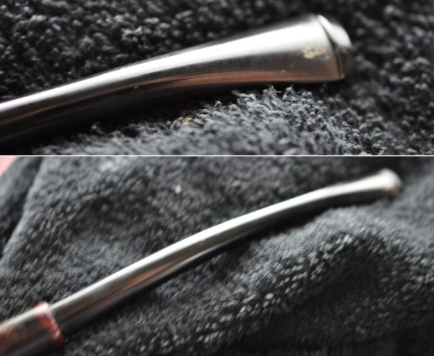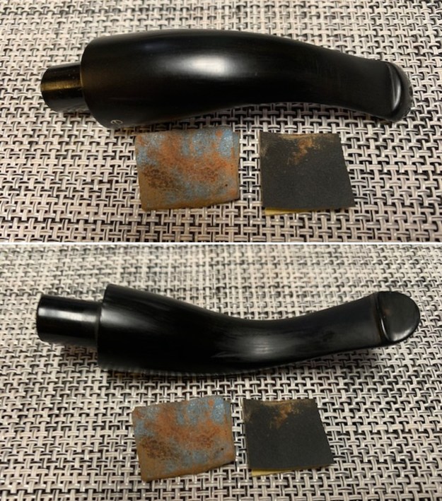 Well, time to get to work! I started by wiping the stem with Murphy’s Oil Soap on some cotton pads, then cleaned out the inside with pipe cleaners and isopropyl alcohol. Fortunately, it wasn’t overly dirty, and it only needed a handful of pipe cleaners. One of the odd features of this pipe was that the tenon was also made of horn. I quite liked that feature, but it did make it a pain to clean.