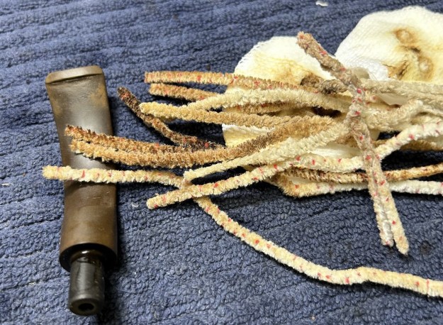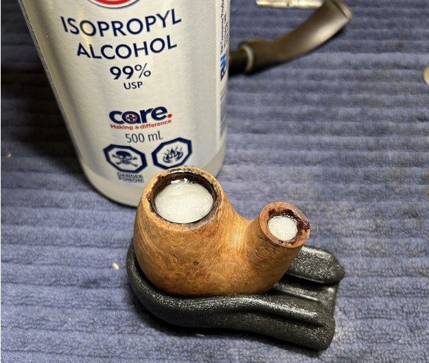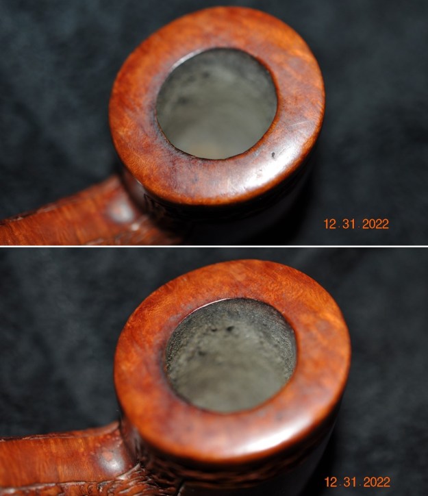 Jeff had done a great job cleaning up the pipe as usual. He reamed the pipe with a PipNet reamer and cut back the cake back to the bare briar. He cleaned up the walls with a Savinelli Fitsall Pipe Knife. He scrubbed the interior of the bowl and shank with pipe cleaners, cotton swabs and alcohol to remove the tars and oils. He scrubbed the exterior of the pipe with Murphy’s Oil Soap and a tooth brush to remove the grime from the finish. He worked on the rim top lava and the darkened spots with the soap and tooth brush. He scrubbed the inside of the stem with alcohol and pipe cleaners. He scrubbed the exterior with Soft Scrub and then soaked it in Briarville Pipe Stem Deoxidizer. He washed it off with warm water to remove the Deoxidizer. The pipe looked far better when it arrived.