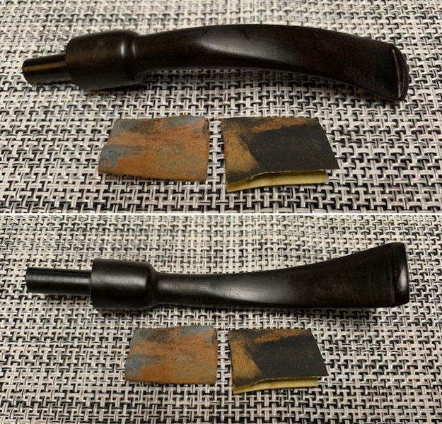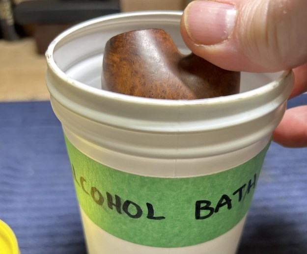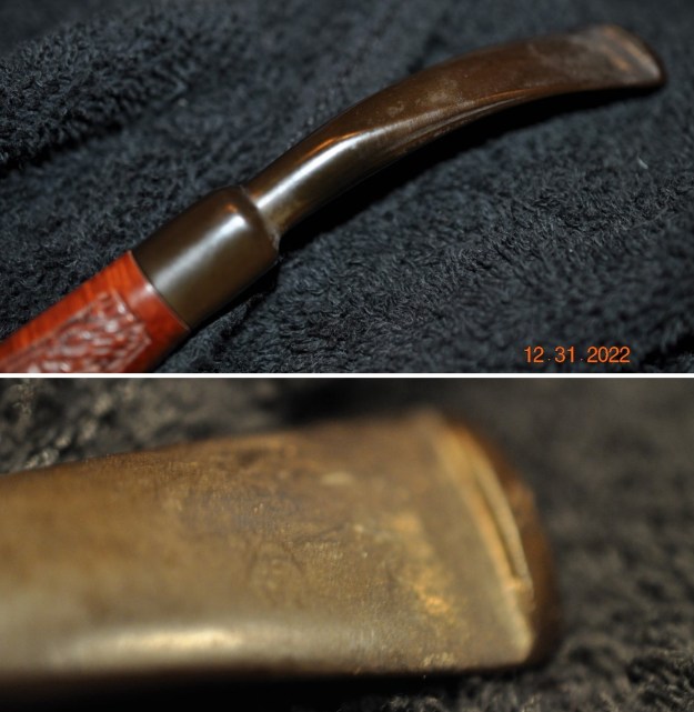 I set the bowl aside and “painted” the stem surface with the flame of a “Bic” lighter to lift the tooth marks. I was able to raise them and I sanded the remaining marks to blend them into the surface of the surrounding vulcanite.