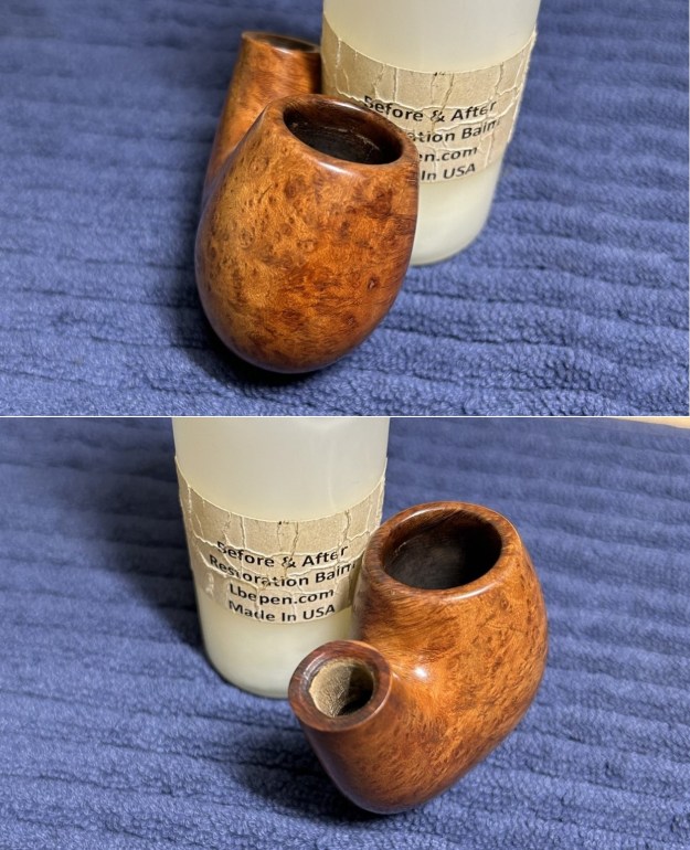 I worked some Before & After Restoration Balm into the surface of the bowl and shank with my fingertips to clean, enliven and protect the briar. I let the balm sit for 15 minutes and then buffed with a cotton cloth to raise the shine. The photos show the bowl at this point in the restoration process.
