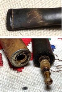 The a photo of the rim top show the thick lava coat that flows out of the bowl and over the edge of the bowl. It is hard to know what the edges of the bowl – inner and outer – look like because of the lava and cake. The photos of the stem show the heavy oxidation and tooth marks and chatter on both sides.