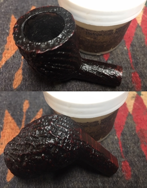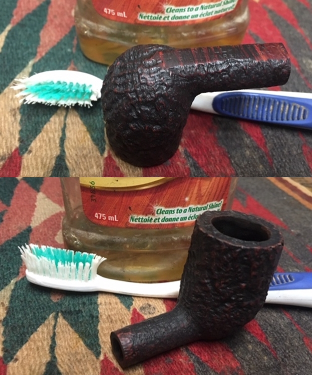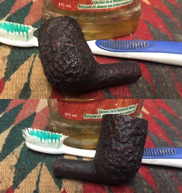 With the bowl reamed and rim top cleaned I scrubbed the sandblast finish. This is pretty much my process in cleaning either sandblast or rusticated finishes. I scrubbed it with undiluted Murphy’s Oil Soap and a tooth brush to remove the grime from the grooves and canyons of the blast. I worked over the tarry lava overflow on the rim with the tooth brush and a brass brush. I rinsed the pipe under running water to remove the grime. I dried it off with a soft towel. The pictures below show the finish after scrubbing and rinsing.