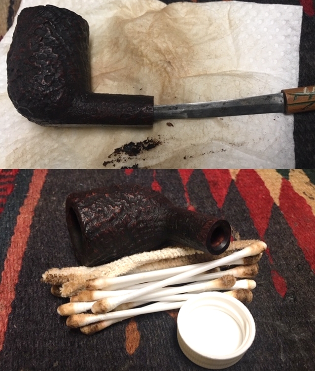 I scraped out the inside of the mortise with a dental spatula to break away the tarry buildup on the walls of the shank. I cleaned out the internals of the bowl, shank and the airway in the shank and the stem with alcohol, pipe cleaners and cotton swabs until they came out clean. It was very dirty in the shank and stem but now it not only looks clean but smells clean.