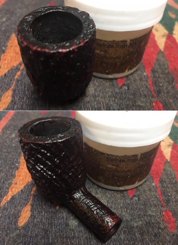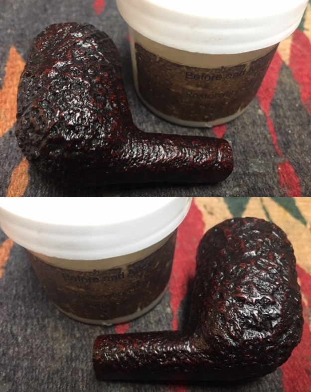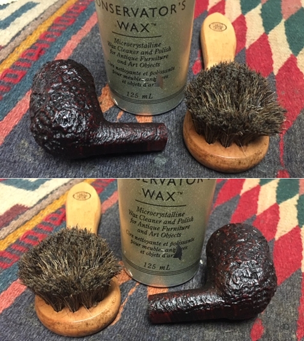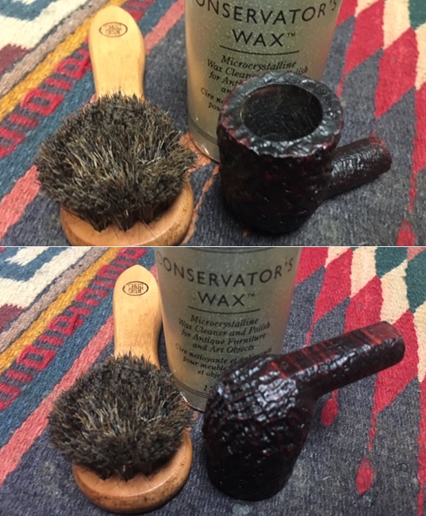 I gave the bowl several coats of Conservator’s Wax and buffed it with a shoe brush after each coat of wax to raise the shine. The bowl looks really good at this point. The sandblast grain just shines and is showing all of the different layers of colour that make up a Dunhill Tanshell finish.