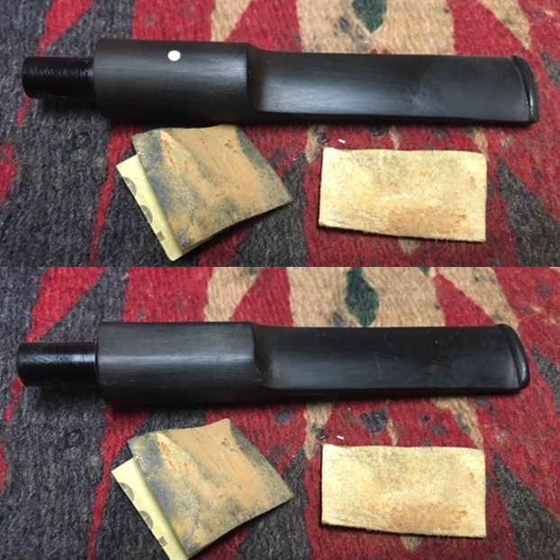 I set the bowl aside and turned my attention to the stem. I sanded out the majority of the marks and tooth chatter on the surface of the vulcanite with a folded piece of 220 grit sandpaper. I followed the 220 grit sandpaper with 400 grit wet dry sandpaper to minimize the scratching. The two papers combined did a pretty decent job of getting rid of the tooth marks and chatter as well as the oxidation and calcification. I cleaned up the Teflon/Delrin white tenon as much as possible without changing the diameter.