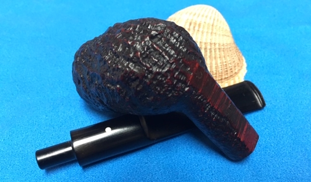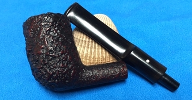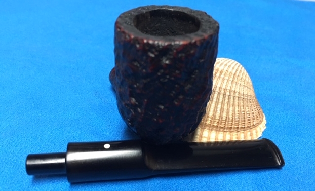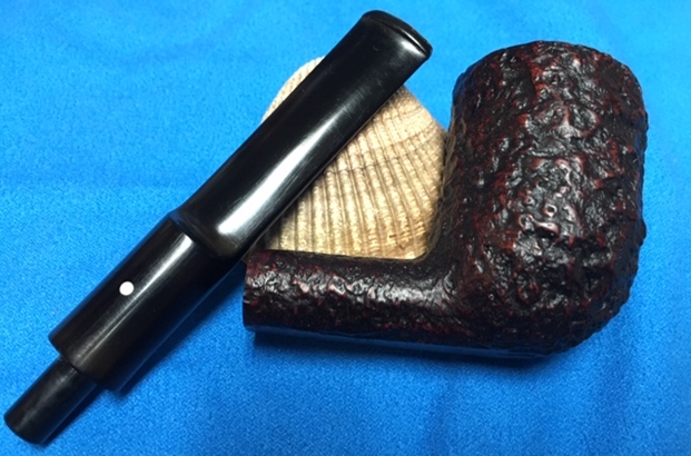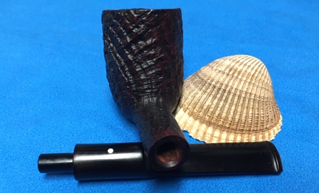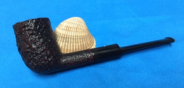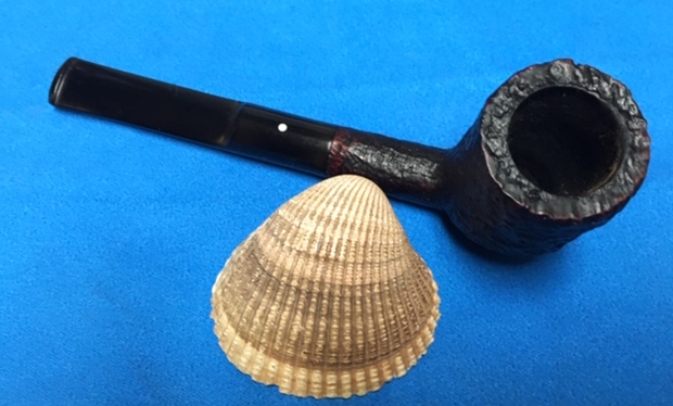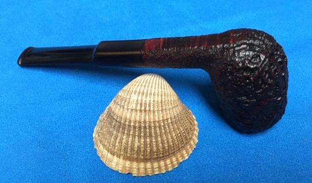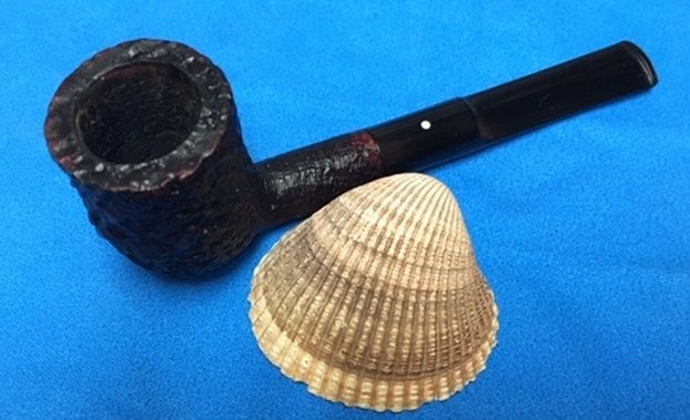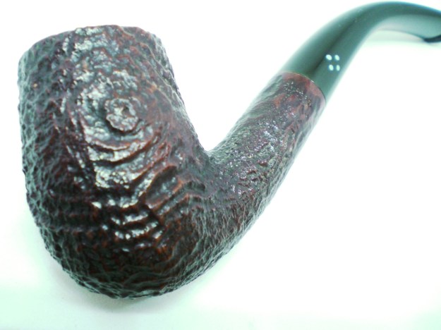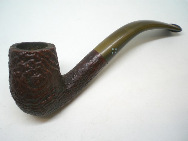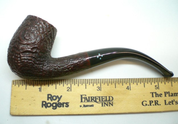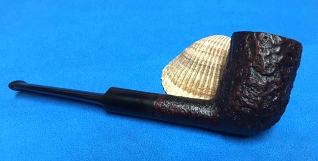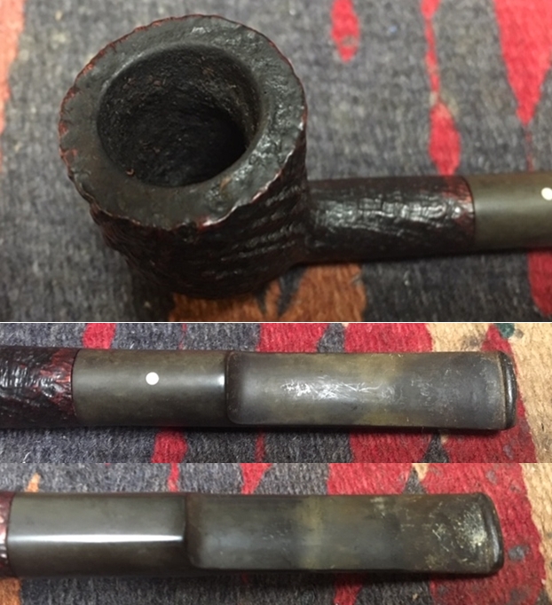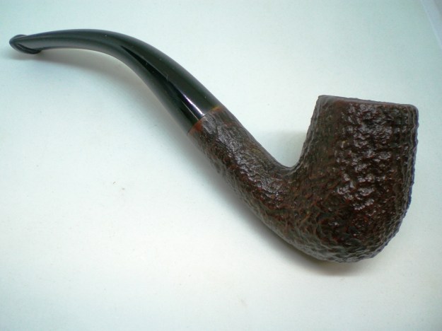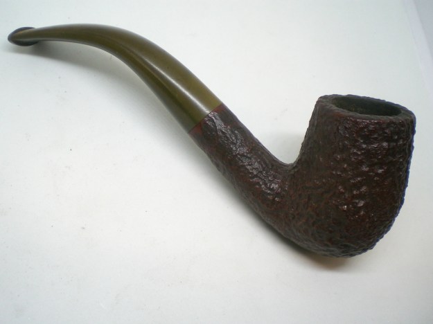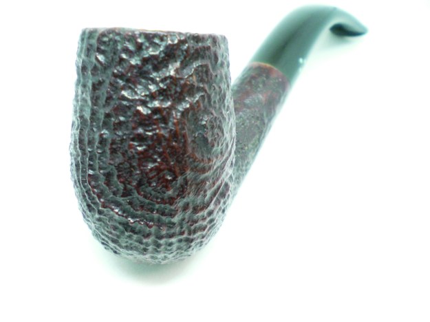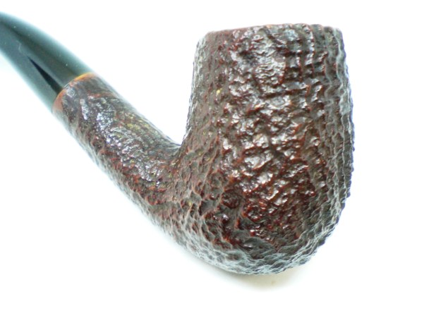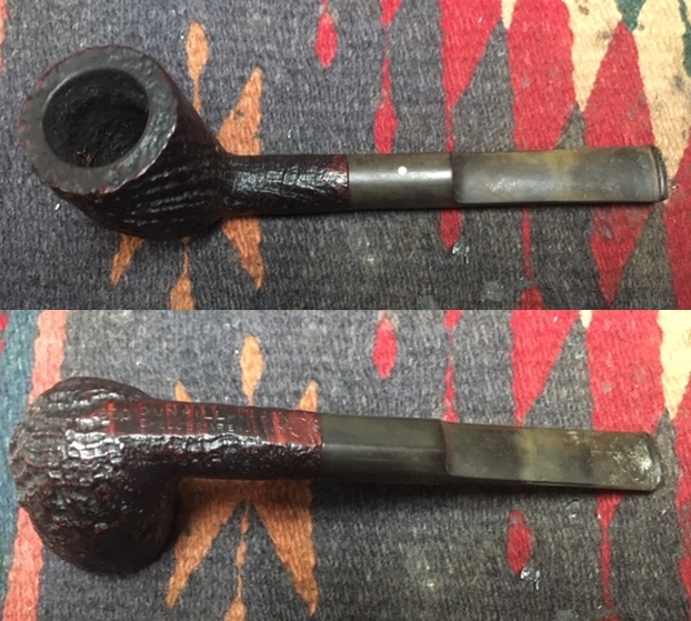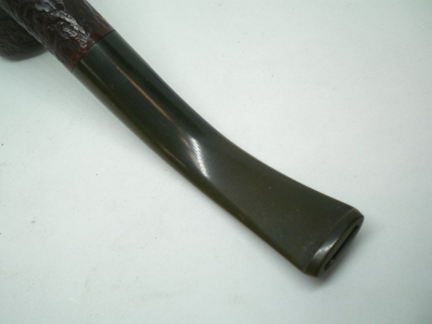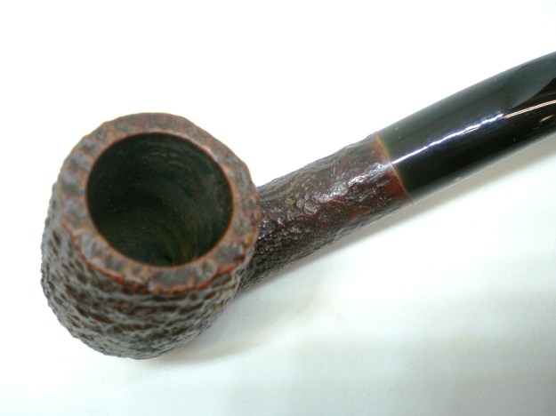 I am making progress on the 25 Dunhills with only 12 more to go. I went through the box of Dunhills shown above and chose the 13th sandblast pipe to work on – it is another Group 4 but this time a Tanshell Prince. It is stamped on the underside of the bowl heel and the shank with the following information. The letters FE F/T which make this a Prince shape with a Fantail stem are followed by Dunhill over Tanshell. Next to that it is stamped Made in England 7 – which dates it as being made in 1968. That is followed by a Circle 4T – Group 4 size Tan Shell. The round shank flows into a tapered fishtail stem that is oxidized and has tooth marks and chatter near the button. There is some calcification on the first inch of the stem ahead of the button and there is some light damage to the top of the button. The Tanshell finish is dirty but nonetheless there is something quite beautiful about the pipe. There is grime and tars filling in much of the craggy finish. The bowl had a thick cake and some lava overflowed on the rim top. There appears to be a little damage on the front inner edge of the rim but after cleaning I will know more. I took pictures of the pipe before I started working on it.