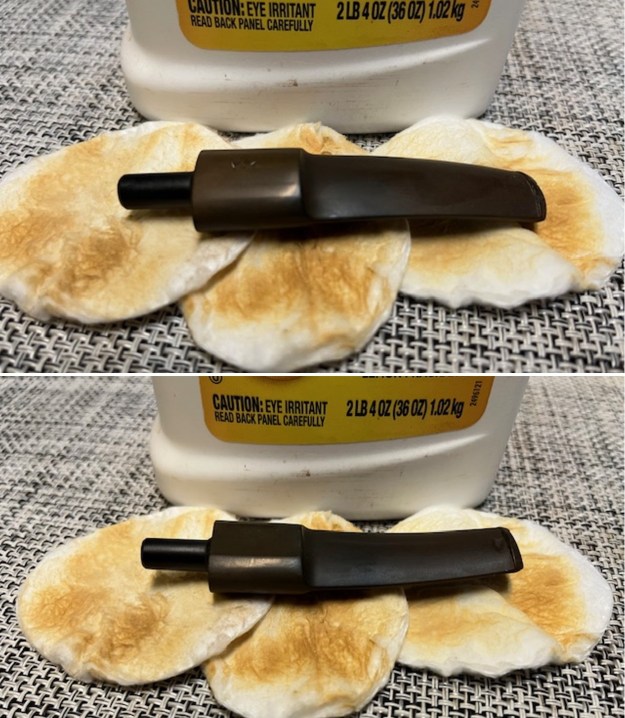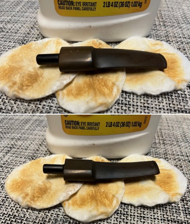 I took a photo of the rim top and the stem to show their condition. Jeff was able to clean up the cake and the lava overflow that was shown in the rim and bowl photos above. The rim top looked very good but there was fill visible on the front of the bowl from the inner edge toward the middle of the rim top. It is visible in the first photo below. The stem looked better, though there were tooth marks and chatter on both sides near the button.