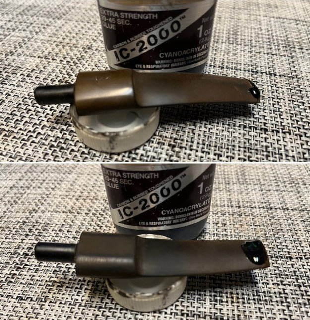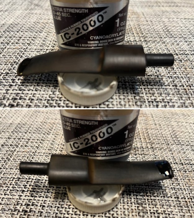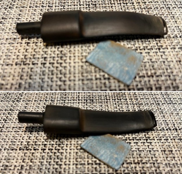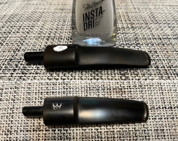 I set the bowl aside and turned my attention to the stem. I filled in the tooth marks on both sides with black CA glue. I set it aside to cure. Once the repairs hardened I smoothed out the repairs with 220 grit sandpaper to blend them into the rest of the surrounding vulcanite.