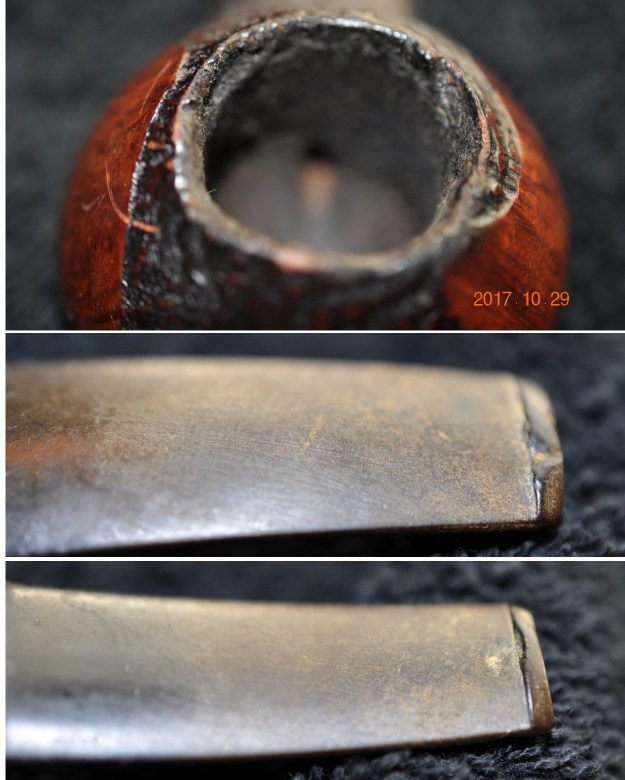 Jeff took photos of the rim and bowl to show the heavy cake and lava spots on the rim top. The inner edge of the rim had some cake on it. There was also a flaw in the briar on the rim top at the front of the bowl extending from the inner edge to the middle of the rim top. It was a dirty pipe but still a beauty. The hard rubber stem had tooth marks and chatter on the top and underside of the stem ahead of the button.
