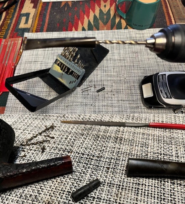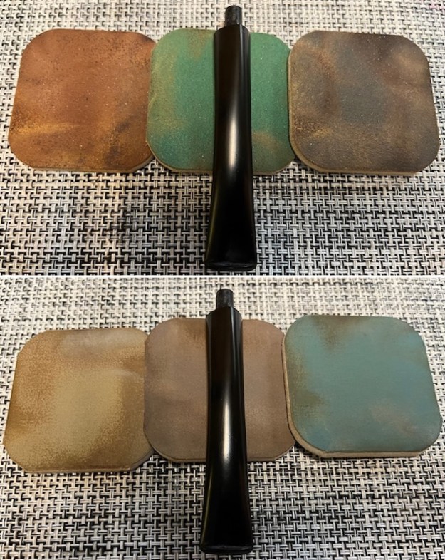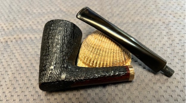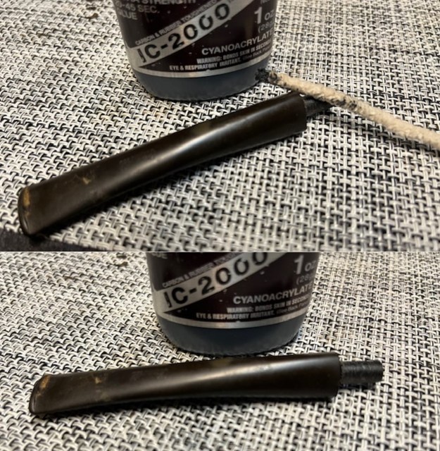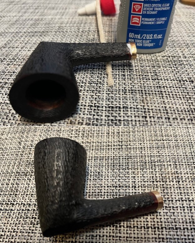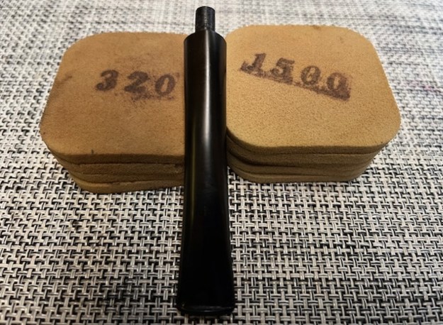 I set aside the bowl and turned my attention to the stem issues. I painted the surface of the stem with the flame of a Bic lighter to lift the tooth marks. I was able to lift all of them enough that sanding would finish blending them. I sanded the stem with 320-3500 grit sanding pads to further blend them in and smooth out the surface of the stem.
