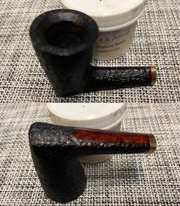 Armed with that information I turned to work on the pipe itself. Jeff had done a great job cleaning up the pipe as usual. He cleaned up the inside of the bowl with a PipNet reamer and a Savinelli Fitsall Pipe Knife. The bowl walls looked very good. He scrubbed the interior of the bowl and shank with shank brushes, pipe cleaners, cotton swabs and alcohol to remove the tars and oils. He scrubbed the exterior of the pipe with Murphy’s Oil Soap and a tooth brush to remove the grime from the finish. He worked on the rim top lava and darkening with the soap and tooth brush. He scrubbed the inside of the stem with alcohol and pipe cleaners. He scrubbed the exterior with Soft Scrub and then soaked it in Briarville’s Pipe Stem Deoxidizer. He washed it off with warm water to remove the deoxidizer. The pipe looked far better. I took photos of the pipe when I received it before I started working on it.