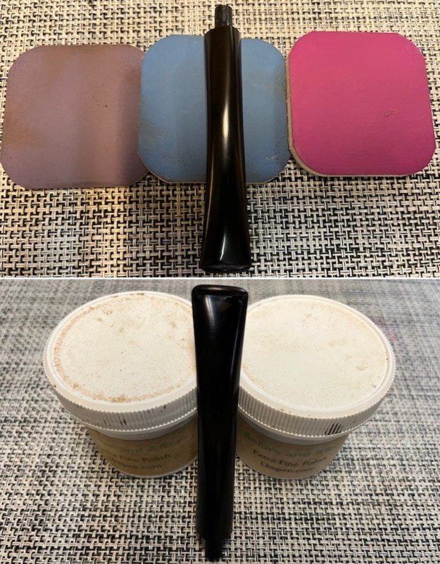 I polished the vulcanite with micromesh sanding pads – 1500-12000 grit pads. I wiped it down with a damp cloth after each sanding pad. I used Before & After Pipe Polish – both Fine and Extra Fine to further polish the stem.
