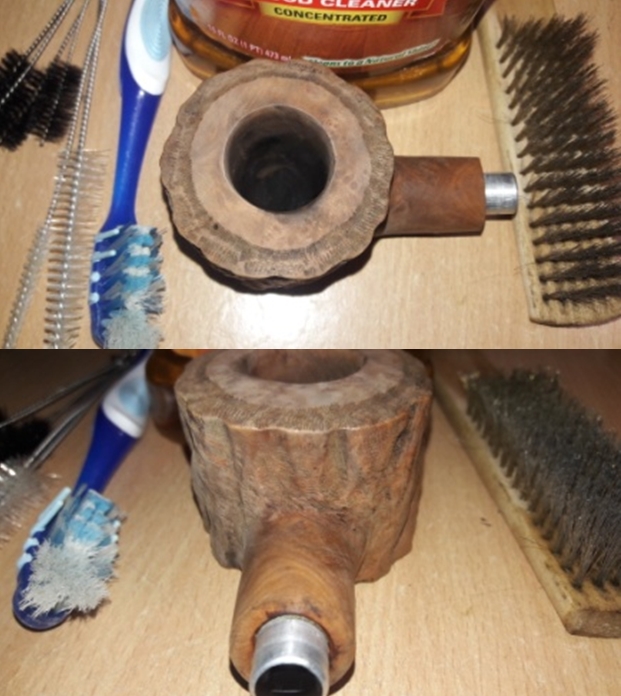 Armed with that information I turned to work on the pipe itself. Jeff had done a great job cleaning up the pipe as usual. He reamed the pipe with a PipNet reamer and cut back the cake back to the bare briar. He cleaned up the walls with a Savinelli Fitsall Pipe Knife. He scrubbed the interior of the bowl and shank with pipe cleaners, cotton swabs and alcohol to remove the tars and oils. He scrubbed the exterior of the pipe with Murphy’s Oil Soap and a tooth brush to remove the grime from the finish. Jeff cleaned up this stem even though it would probably be replaced. He scrubbed the inside of the stem with alcohol and pipe cleaners. He scrubbed the exterior with Soft Scrub and then soaked it in Before & After Deoxidizer. He washed it off with warm water to remove the deoxidizer. The pipe looked far better. I took photos of the pipe when I received it before I started working on it. You can see the misfit stem.