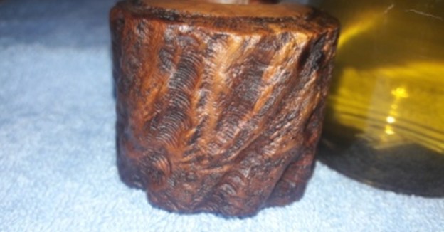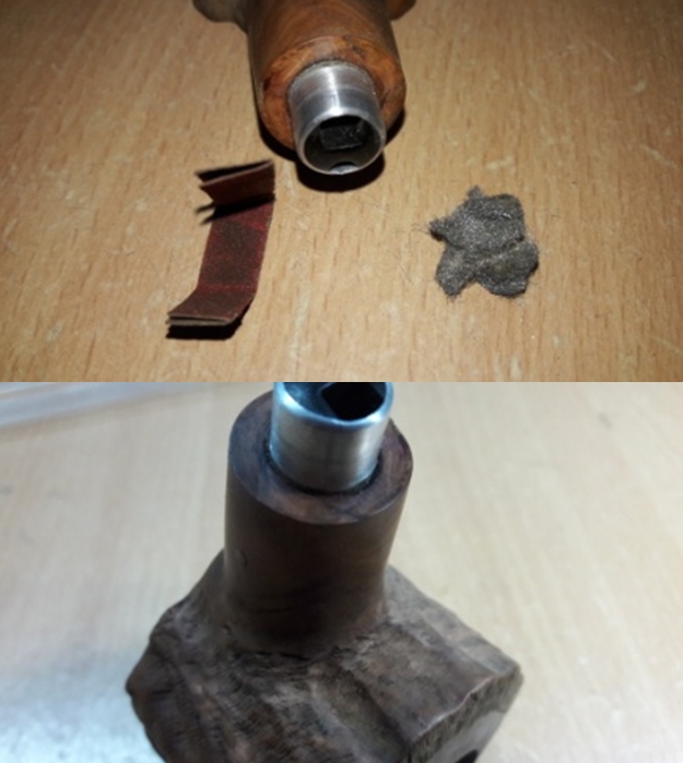 I used the topping board to lightly sand the shank end but it was not to be without removing more of the shank end than I wanted. The chips out of the shank end made it necessary to sand deeper. I decided to use a thin brass band that also capped the end of the shank. I coated the shank end with some all-purpose glue and pressed the band in place. I put the new stem on the shank and adjusted the band to take care of any deviation in the face of the shank. I removed the stem and set the bowl aside to let the glue cure.