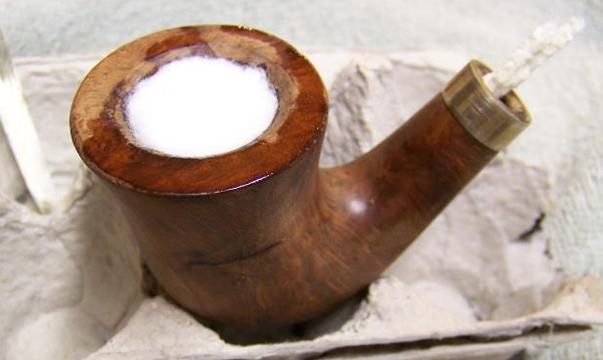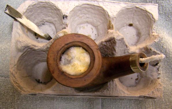 Next, I wanted to remove the ghosts of the previous tobacco that I could still smell in the chamber with an alcohol soak. I use the cotton ball method because it seems to do the job and is easier to clean up than the salt method. This chamber needed three cotton balls and I used 98% grain alcohol for the soak. I placed a cap over the top of the bowl for the first couple of hours to keep the alcohol from evaporating too fast then I removed the cap so the evaporative action can draw out the tars from the briar.